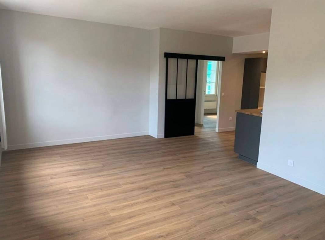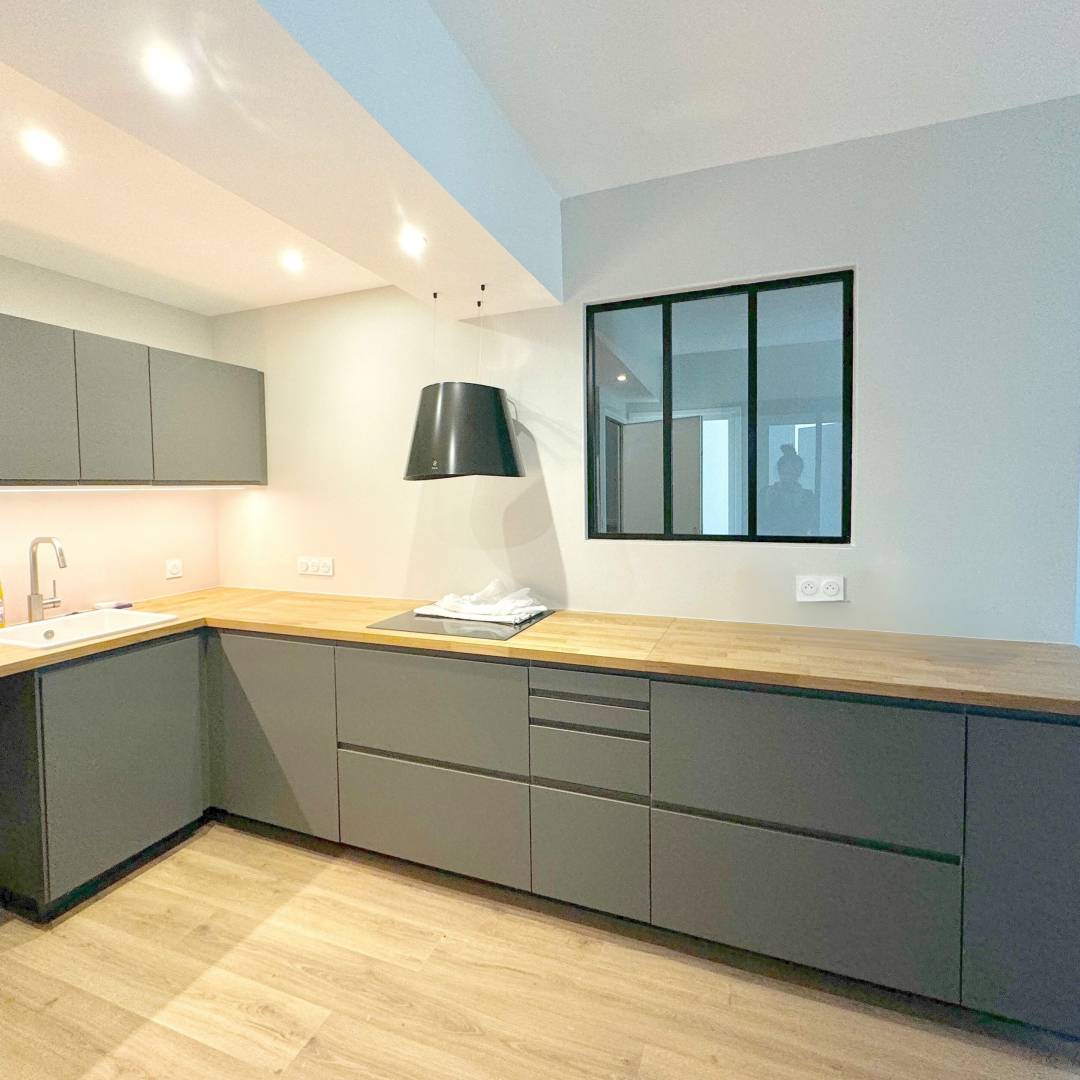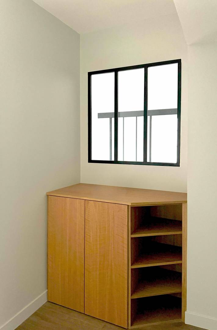 L'objectif de cette rénovation était de repenser les espaces de façon à ce qu'ils soient fonctionnels tout en les dissociant les uns des autres, sans qu'ils soient visuellement fermés.  Nous avions la contrainte de deux poteaux techniques ne pouvant être retirés ou déplacés. Le projet s'est naturellement tourné autour de ces problématiques. Créer une cuisine ouverte sur la pièce de vie, tout en intégrant une entrée distincte à l'appartement.  Nous avons alors liés les poteaux au cloison de séparation d'espace, en y intégrant une verrière entre l'entrée et la cuisine, et un claustra entre l'entrée et le salon-séjour. De cette manière la lumière continue de circuler naturellement dans les différentes pièces.  Côté entrée, nous avons réalisés deux meubles sur mesure pour l'optimisation de rangements.  Cet appartement a été rénové entièrement.