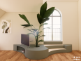 Cette estrade permet à la fois de rejoindre le balcon de l'appartement par des marches, où son accès initial était surélevé, un meuble TV avec rangements, ainsi qu'une partie pouvant accueillir une plante d'intérieur pour apporter une touche de végétal dans un intérieur en intérieur.
