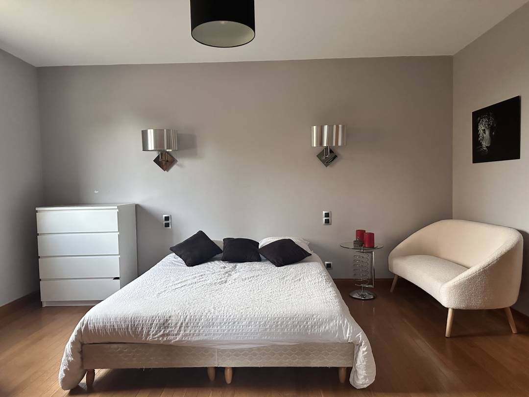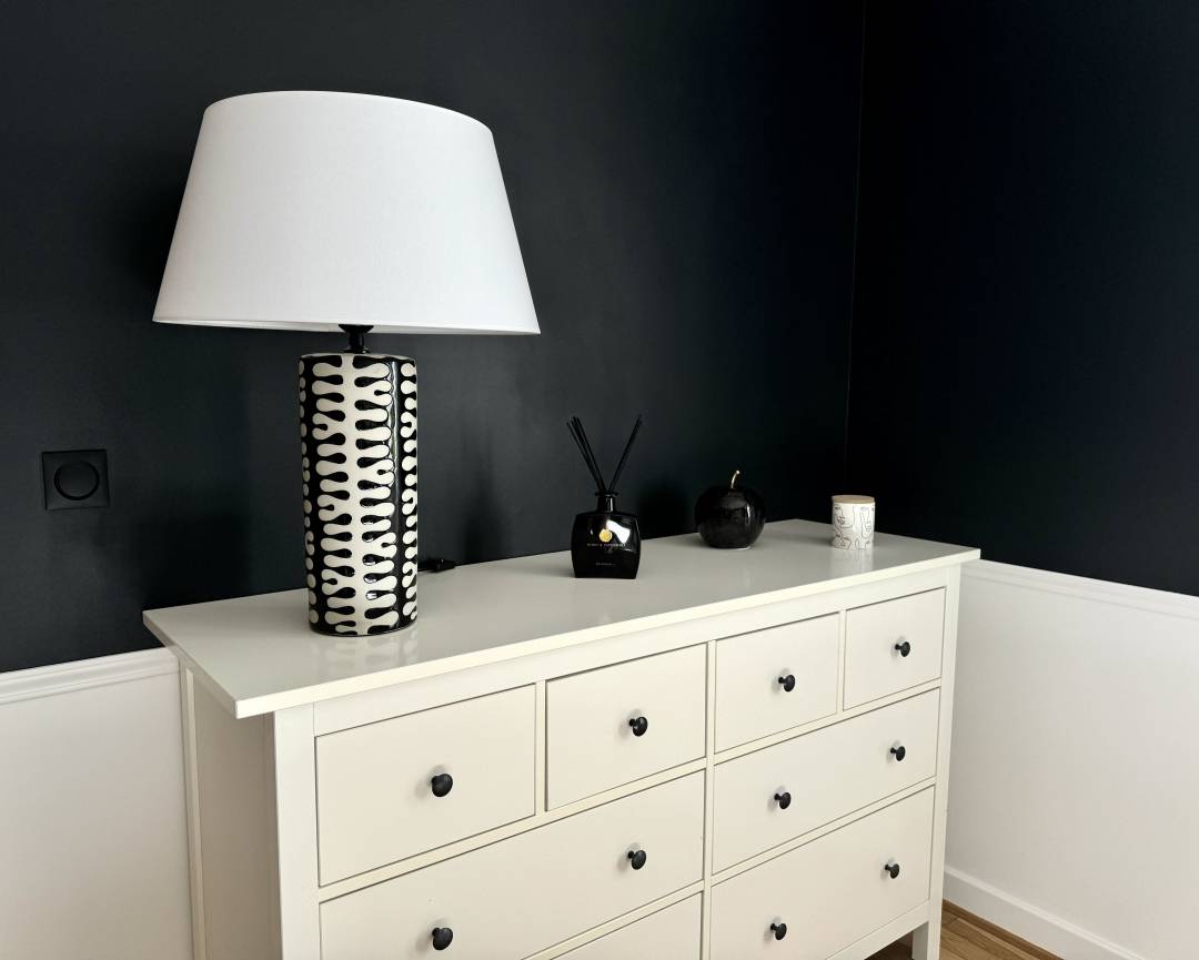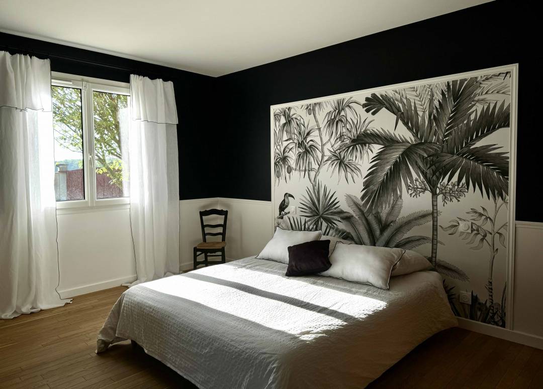 Noir et blanc étaient les maîtres-mots de ce projet. Les clients ont eu envie de contemporain et de sobriété en apportant de la lumière et de la pureté. Créer un lien visuel entre ces deux espaces permet de renforcer l'espace invités. Espace salle d'eau : Recouvrir de faïence l'entièreté des murs était un choix. Etant naturellement attirés par les carreaux de métro, le choix était rapidement orienté. L'idée initiale était de créer un sol entièrement noir, néanmoins la région de ce lieu étant très propice aux eaux calcaires, nous avons sélectionné une base blanche avec des touches de noires par parcimonie en optant pour un carrelage octogonal et cabochon au sol. Espace chambre : Lorsque des soubassements sont crées, afin d'apporter de la luminosité et de la profondeur à l'espace, on opte pour du blanc en partie basse et de la couleur en partie haute. Cela permet de créer une ambiance chaleureuse et accueillante. Le détail des moulures (cimaises) apporte de la profondeur et du relief à cet espace. Le sol a lui été rénové avec ponçage et vitrification.