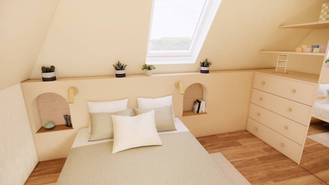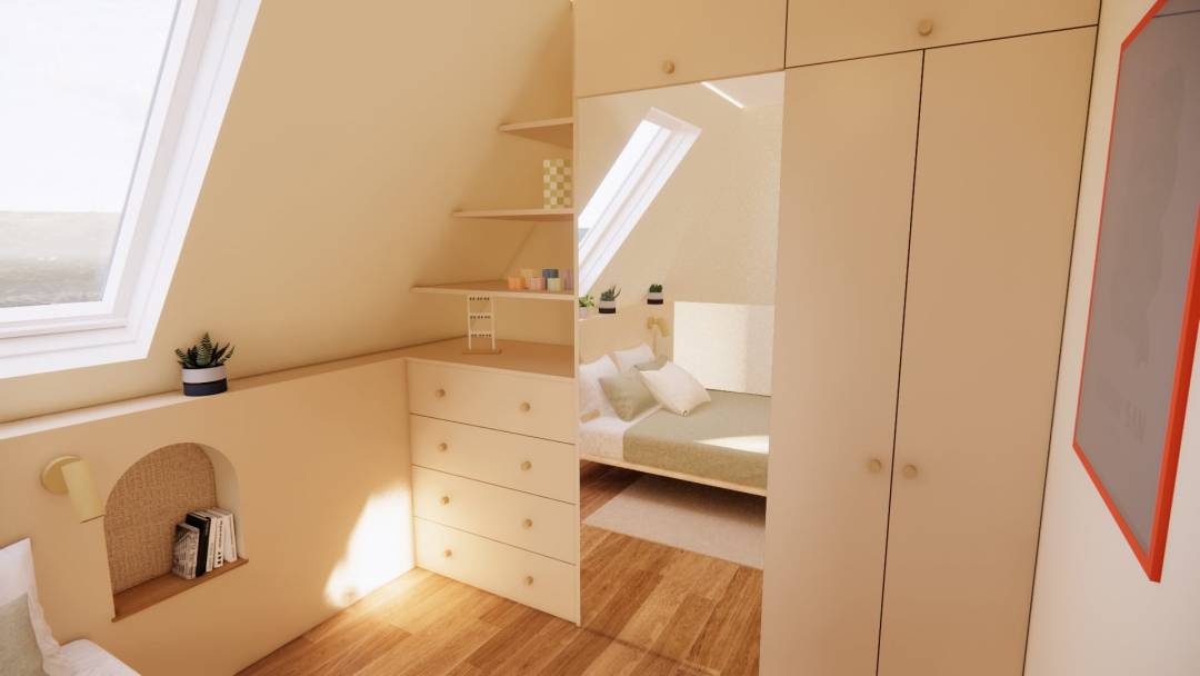 Rénovation d'un appartement tourangeaux de 30m2 carrez et environ 45m2 au sol. L'idée est d'optimiser ce studio en créant différents espaces, tout en apportant du caractère et de la personnalité avec un côté chaleureux pouvant recevoir des amis. Grâce à sa triple exposition, ce studio a l'avantage d'être traversé par la lumière, nous avons pu délimiter les espaces en utilisant le système de verrière (en bois ici pour une harmonie visuelle) afin que la lumière puisse circuler dans les différentes pièces. Côté cuisine, même si cela reste un appartement avec une faible superficie, un ensemble complet d'électroménager est présent. Créer une assise avec des banquettes permet à la fois d'optimiser les rangements, tout en ayant un espace pour manger mais également pour travailler. Cette table fait office de table à manger, comme de bureau. Le salon est à la fois cosy et réconfortant avec ses assises arrondies, et voluptueuses. Dans la chambre nous avons optimiser les rangements avec le mur mitoyen de salle de bain, où la porte à double miroir peut être ouverte et rabattue le long de la profondeur des rangements. Créer des meubles jusqu'au plafond permet de ne pas réduire visuellement les espaces, tout en maximisant les rangements. Dans la salle d'eau deux ouvertures avec des fenêtres de toit ont été faites, une machine à laver encastrée dans un meuble sur mesure. Nous avons fait le choix de créer un espace avec un toilette fermé, toujours avec ce système de verrière avec du verre strié pour flouter. Nous retrouvons les arrondis à différents endroits, les portes verrières de séparation, les niches en tête de lit, la forme de l'assise en cuisine, paroi de douche, ainsi que le mobilier.