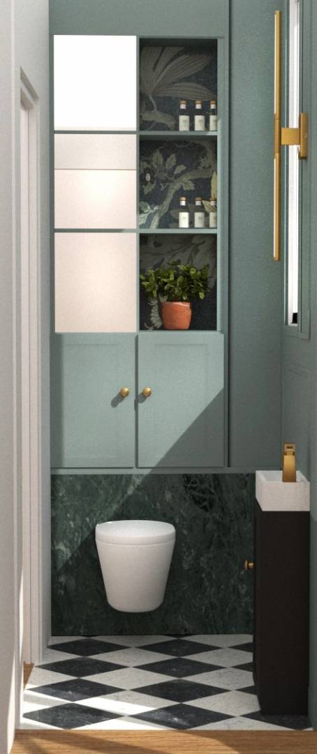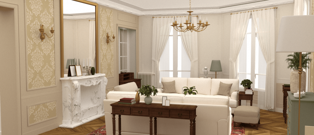 Conception et rénovation d'un appartement à Paris 17, rénovation des salles de bains et du séjour dans un style haussmannien classique utilisant une palette de couleurs pastel.