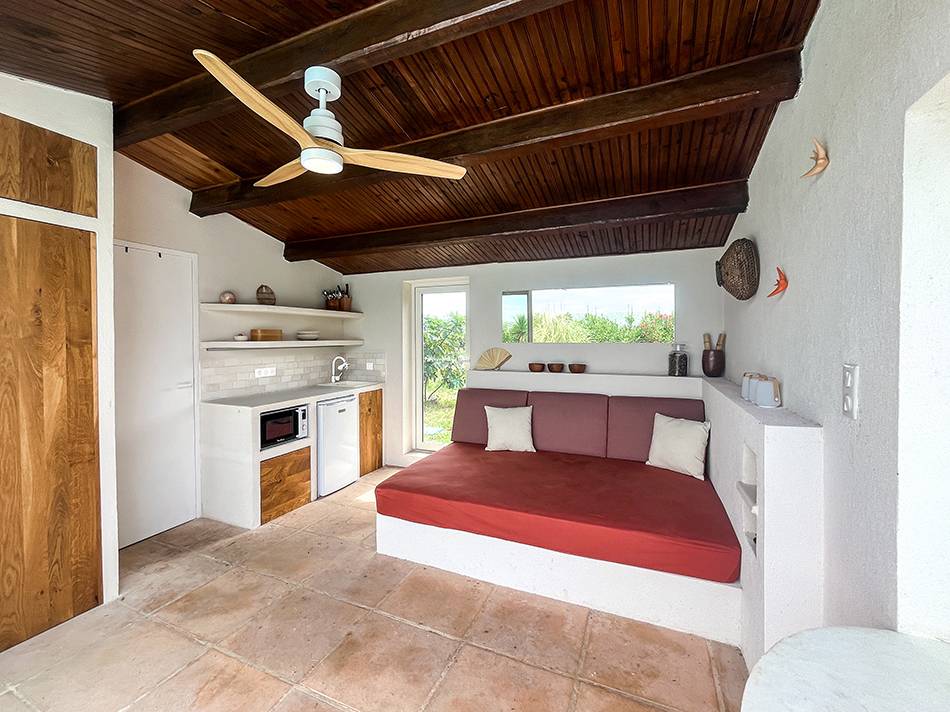 L’espace peut désormais servir de studio d’appoint, mais il a surtout beaucoup gagné en confort et esthétique pour sa fonction première d’espace de détente et de convivialité à l’ombre au bord de la piscine.