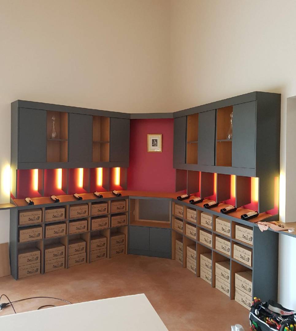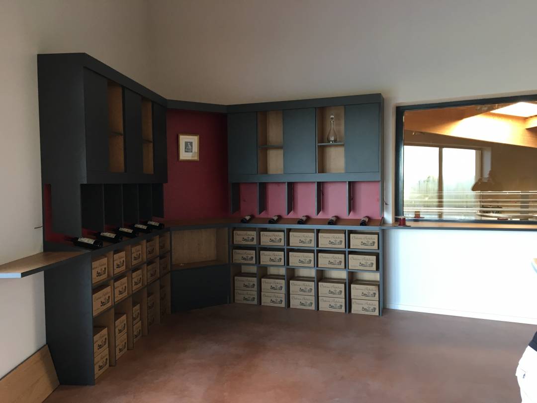 A partir d'un cahier des charges précis, création et réalisation d'une table de dégustation technique et d'un ensemble mobilier pour la présentation du vin.