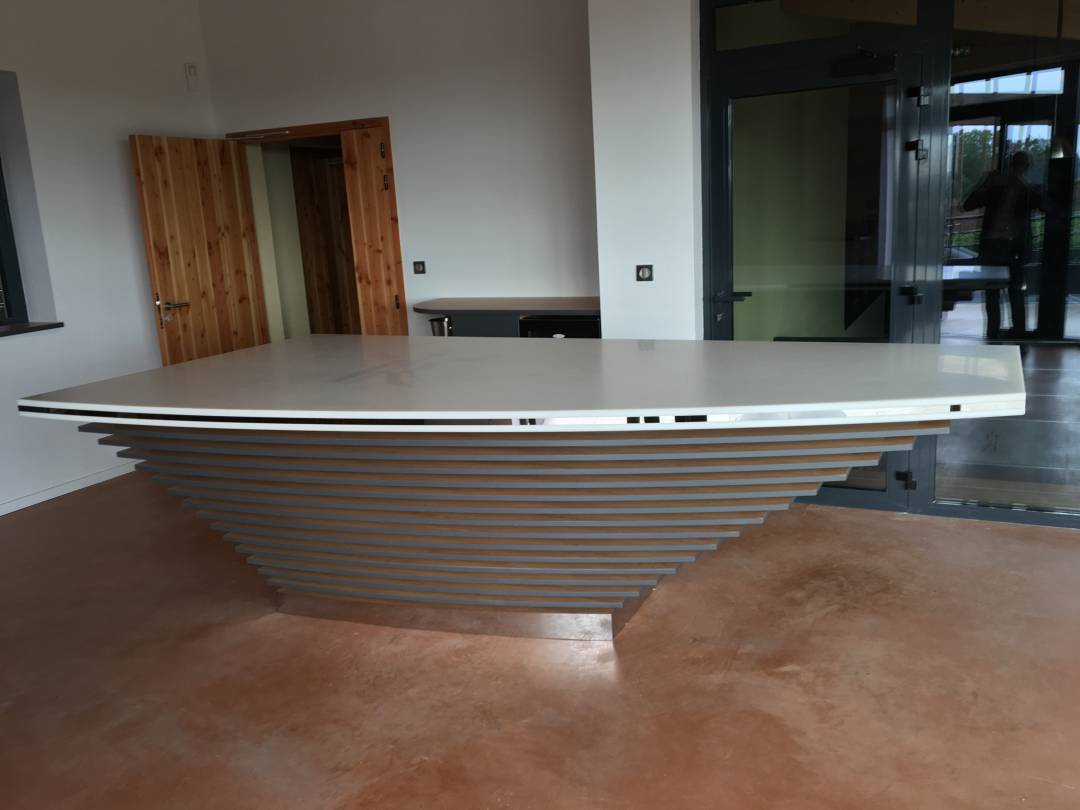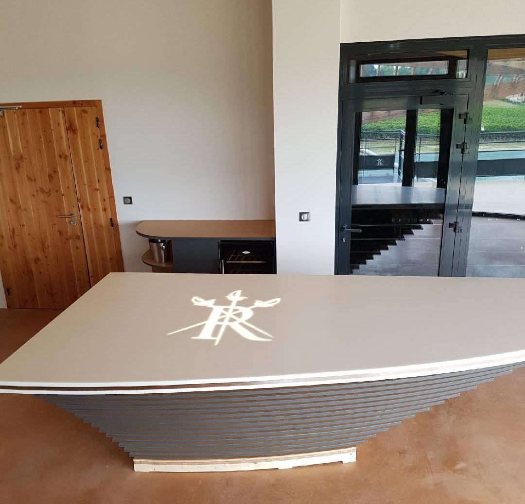 Le plateau de la table devant être blanc a été réalisé en corian dans lequel il a été incrusté le logo du château visible par retro-éclairage.