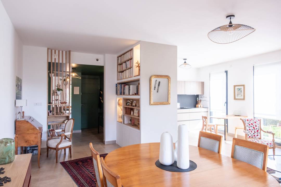 Je leur ai proposé de la réorganiser pour mieux délimiter les espaces et fluidifier la circulation, en modifiant une partie de la cuisine et en inversant salon et salle à manger. Une partie des agencements d’origine dont le coloris se mariait mal avec leurs meubles anciens ont été remplacés notamment par une grande bibliothèque maçonnée avec niches en chêne massif et éclairage intégré.