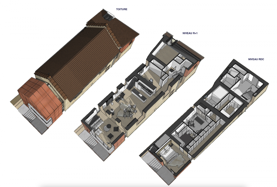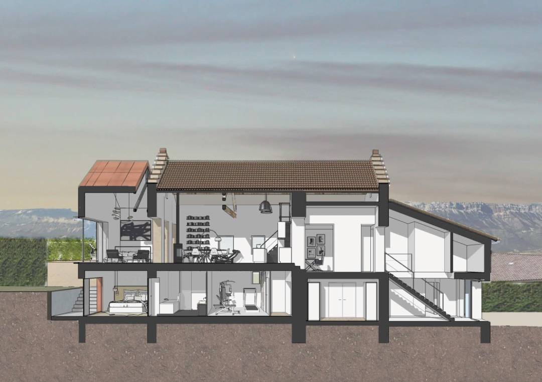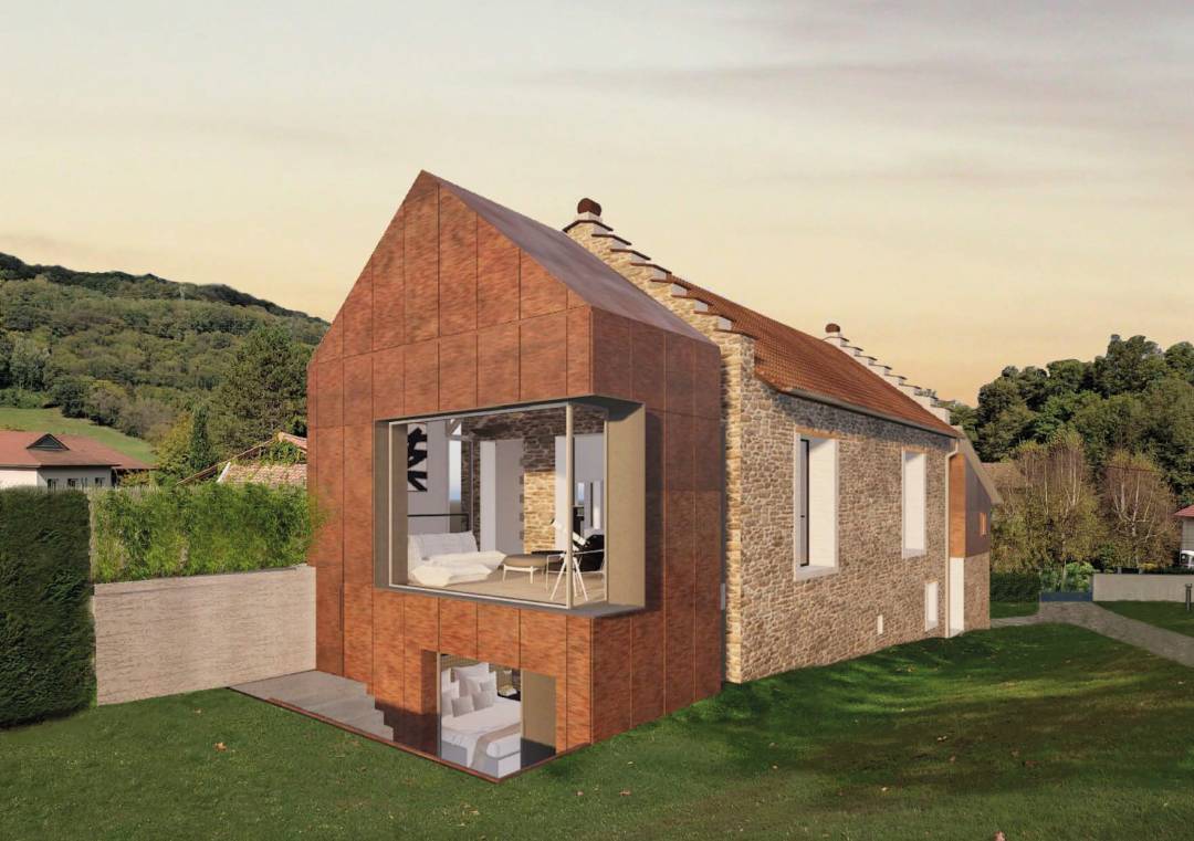 RÉNOVATION D'UNE MAISON & CRÉATION D'UNE EXTENSION Allier le contemporain à l'ancien Le projet consiste en la rénovation d’une partie de la maison existante et en la création d’une extension sur deux niveaux en profitant de l’emprise au sol de la terrasse existante. Les interventions de projet sont également la création d’un garage permettant de stationner trois véhicules et un atelier de stockage, l’aménagement du jardin et la création d’une piscine. La bâtisse et son parc sont situés dans un secteur calme et arboré. Les espèces remarquables d’arbres présentes sur le site et les avoisinants apportent une atmosphère apaisante au lieu. La parcelle en longueur est traitée de manière séquentielle afin de redéfinir chaque espace. La famille souhaite bénéficier d’un espace plus généreux pour leur vie quotidienne et pour recevoir leurs amis, ainsi que de nouveaux espaces tels qu’un dressing d’entrée, une salle de musculation et une suite parentale. L’extension présente un volume minimaliste en continuité avec celui de la bâtisse existante. Une “lame” vitrée établit le lien entre ancien et nouveau tout en respectant les composants des façades existantes. Le parement extérieur en acier corten est présent au niveau des parois murales et de la toiture. Le choix de menuiseries performantes, d’une isolation qualitative, de BSO et d’un débord fin à l’extérieur au niveau de la menuiserie du séjour assureront un confort thermique autant en période hivernale qu’en période estivale. La ventilation et la climatisation seront proportionnées à la nouvelle échelle du projet et intégrées au volume dans les gaines en conservant les bénéfices du puit canadien. La recherche d’homogénéité du projet tant à l’extérieur qu’à l’intérieur est la clé de voûte de ce projet audacieux et contemporain.
