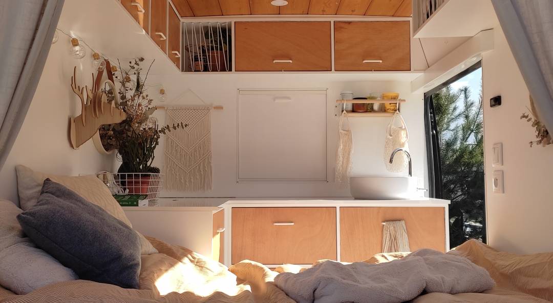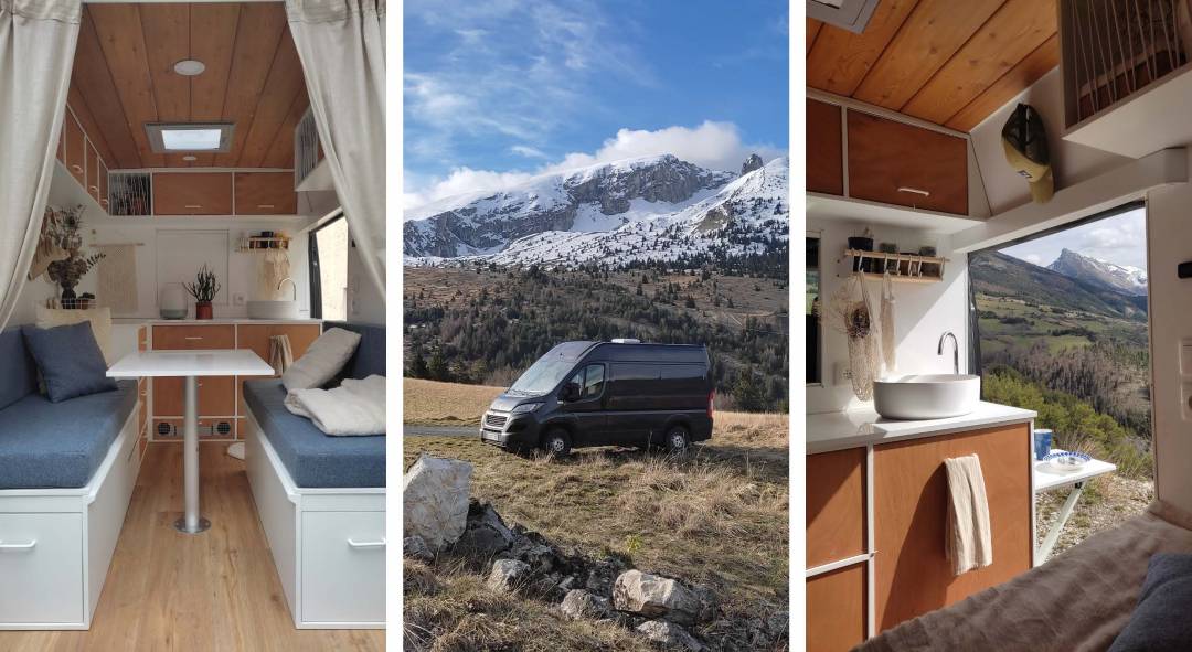 AMÉNAGEMENT D’UN FOURGON AMÉNAGÉ Optimiser un mini-espace Lier l’esthétique, le fonctionnel et la technique : voilà le challenge correspondant au cahier des charges de ce véhicule de 5 m de long et 2,5 m de hauteur. L’ambiance souhaitée par l’architecte a été de créer un contraste entre le contenant extérieur noir et son contenu intérieur en blanc et en bois. L’idée était également de rapporter un maximum de lumière et de vues possibles vers l’extérieur, d’où la pose d’un lanterneau en toiture, d’une fenêtre sur la porte latérale et de deux fenêtres sur les portes arrière. La hauteur sous plafond et la disposition des meubles permettent de pratiquer l’espace en étant debout, assis ou allongé. La mini-surface se compose de la partie meuble bas/circulation et de la partie canapé-table ou lit selon le choix. Une tablette a été fixée sur le côté du meuble lavabo afin de pouvoir cuisiner dehors lorsque la porte latérale est ouverte. Il est aisé d’accéder aux toilettes sèches et aux réserves d’eau, d’allumer le chauffage, de passer devant si besoin par la trappe située entre la partie conducteur et la partie arrière. Une batterie auxiliaire, placée judicieusement sous les assises, est reliée à l’électricité intégrée dans le complexe ossature bois et isolation, elle-même posée au niveau du sol, des parois et du plafond.