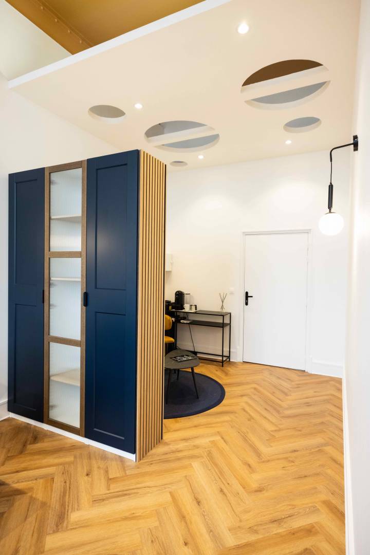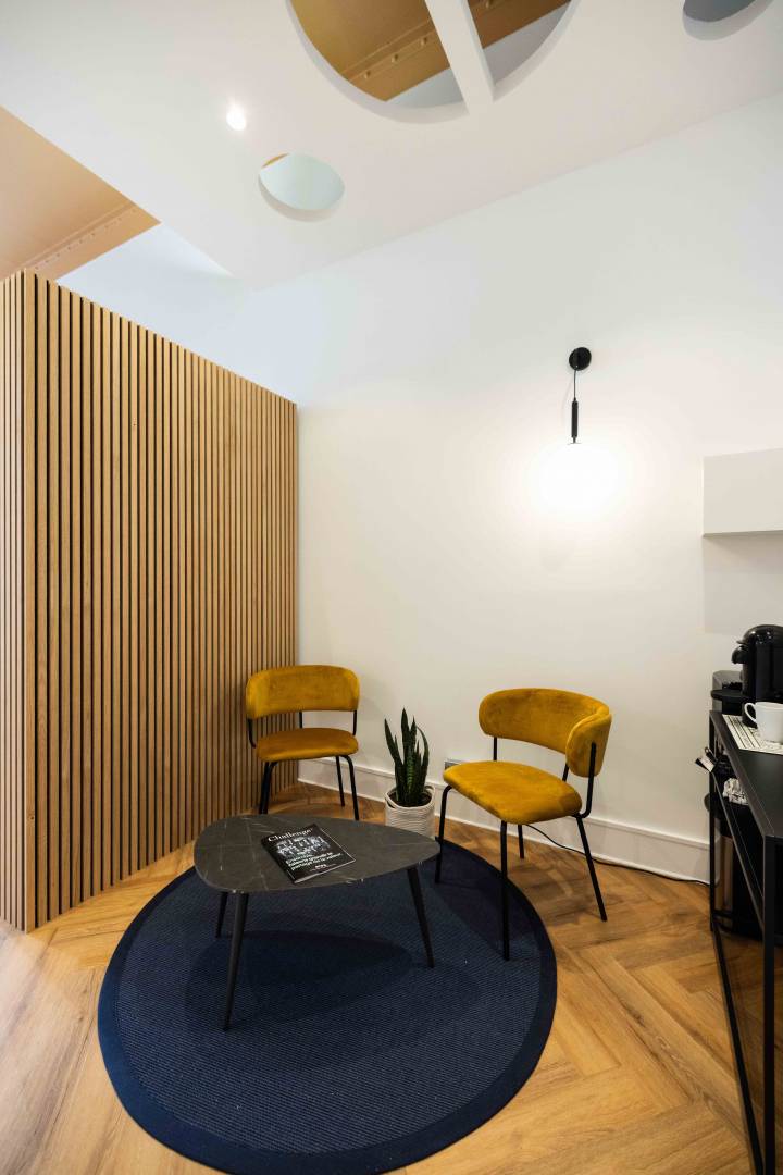 Architecture décoration d'intérieur pour un gestionnaire de patrimoine sur La Madeleine.  Pour ce projet, nous nous sommes imprégnés de l'identité de marque de la société, à savoir le jaune et le bleu.  Un aménagement sur-mesure pour 3 espaces :  1. Une salle d'attente, devant pouvoir réunir jusqu'à 3 personnes 2. Un espace bureaux, pour 4 personnes.  3. Une salle de réunion pour 8 personnes.