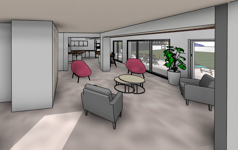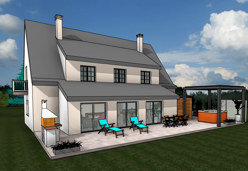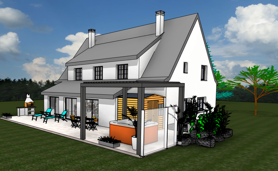 Pour ce projet les clients souhaitaient agrandir leur maison d’habitation en créant une extension, ils souhaitaient aussi aménager leur cuisine et leur salon. Les travaux portent aussi sur l’aménagement extérieur avec la création d’une terrasse, l’installation d’une pergola et d’un jacuzzi. Ma mission était de concevoir cette extension, aménager la cuisine et aussi aménager le terrain, réaliser le permis de construire en vue du dépôt en mairie et réaliser les plans d’exécutions pour les différents artisans.