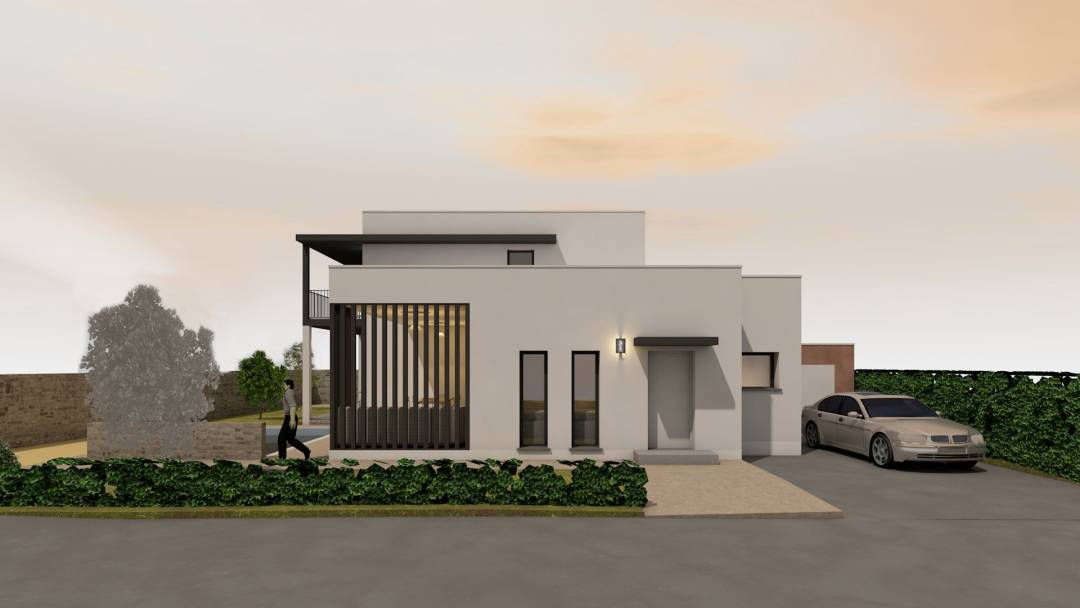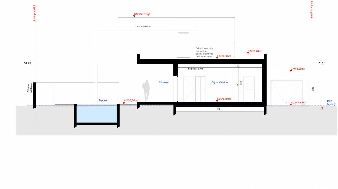 Construction maison individuelle à R+1 avec terrasse et piscine en zone PPRI. Contraintes d'expositions, de voisinages et de surfaces constructibles sur la parcelle. L’exposition Ouest est favorisée afin de bénéficier de l’ensoleillement et de créer des espaces extérieurs variés. La volumétrie minimise l’impact visuel sur la maison voisine en permettant de conserver leur exposition avantageuse. Les façades sont discrètes sur les accès communs et s’ouvrent pour les espaces plus privés et intimes.