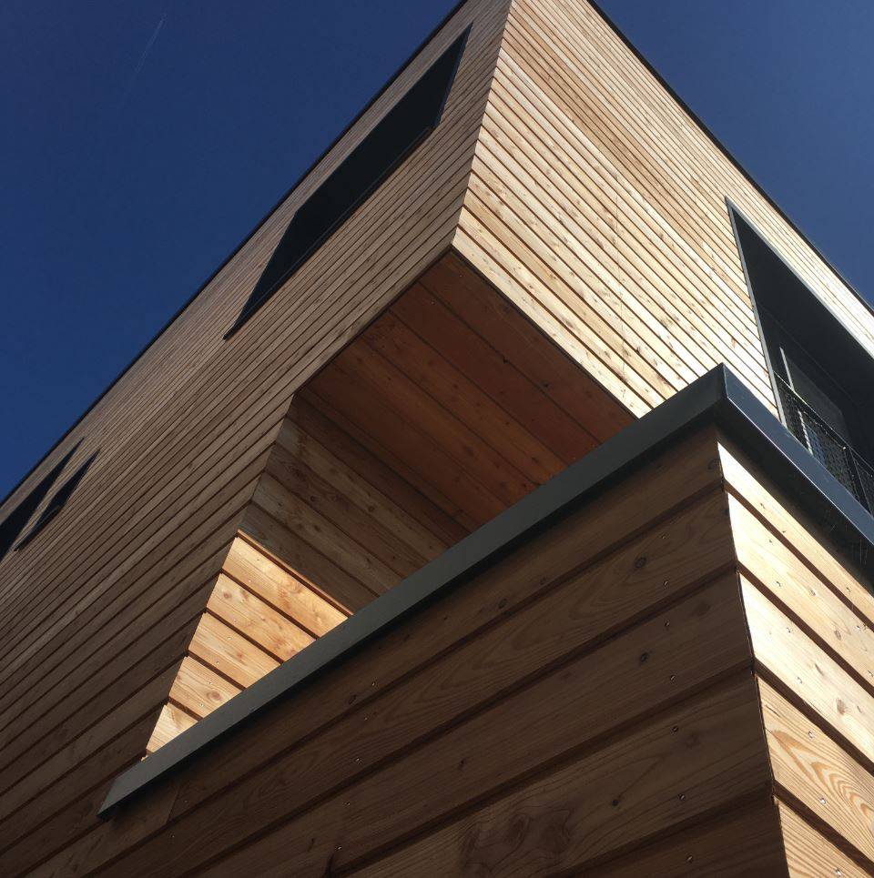 Le projet consiste en la réalisation d'une maison à ossature bois, bardage mélèze de Corrèze Isolant laine de bois 270mm VMC double flux Cuve de récupération des EP pour WC, lave-linge et arrosage du jardin Toiture végétalisée Gardes-corps en filets de pêche recyclés Menuiseries extérieures aluminium à RPT Porte de garage revêtue bardage mélèze la rendant invisible