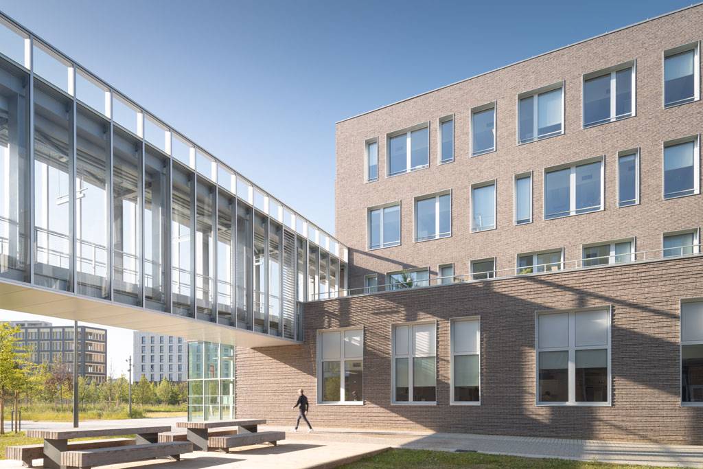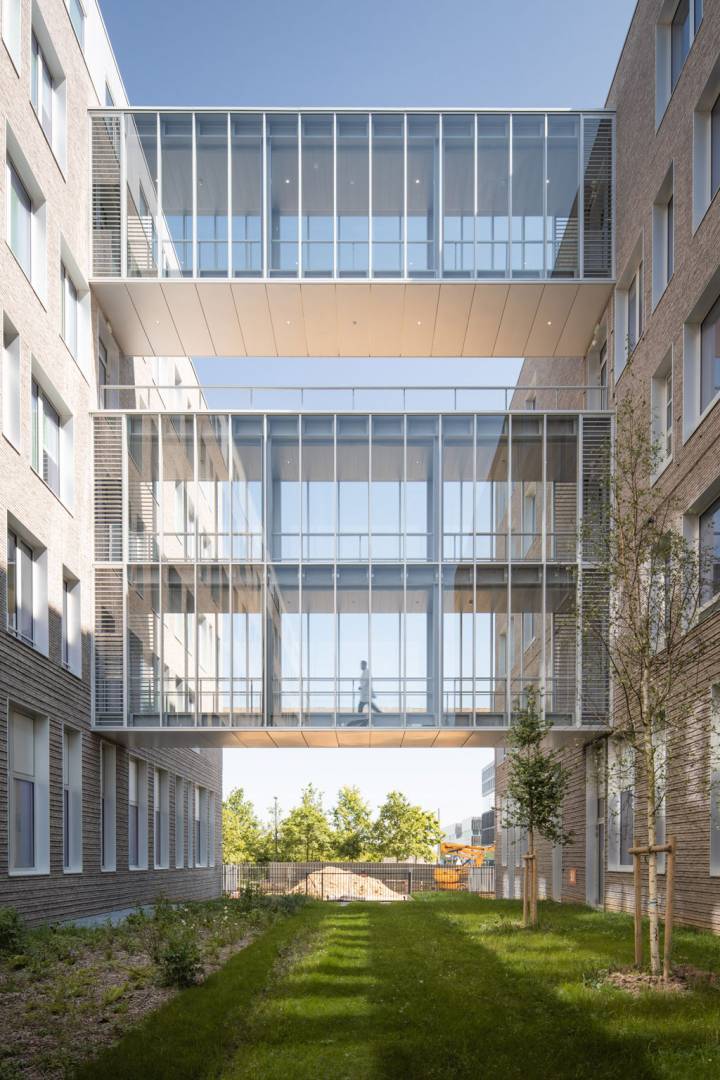 AgroParisTech-INRA associe des pavillons et des bâtiments distincts, dont les volumes expriment leurs fonctionnalités spécifiques en un tout cohérent. La symbolique des rythmes, des répétitions, des allitérations des façades, affirme l’identité partagée du Campus AgroParisTech-INRA : l’unicité s’exprime ici au travers des volumes compacts en brique, avec de grandes ouvertures sur le paysage, illustrant l’ouverture sur les autres, sur le monde. Le volume des bâtiments de recherche s’apparente ainsi à de vastes monolithes ancrés au sol, percés par de larges loggias ouvertes sur le panorama, faisant pénétrer abondamment la lumière jusqu’aux patios, jusqu’au centre de la recherche. Le rythme des façades des bureaux et de la recherche est basé sur le module de 1,50 m avec un sous-multiple permettant le cloisonnement selon des bureaux de 10 m², de 15 m², de 23 m², de 30 m2, de 40 m² et de 50 m². Façades briques. Lumière naturelle, patios. Laboratoires L1, L2, L3. Serres S1 Plateaux évolutifs