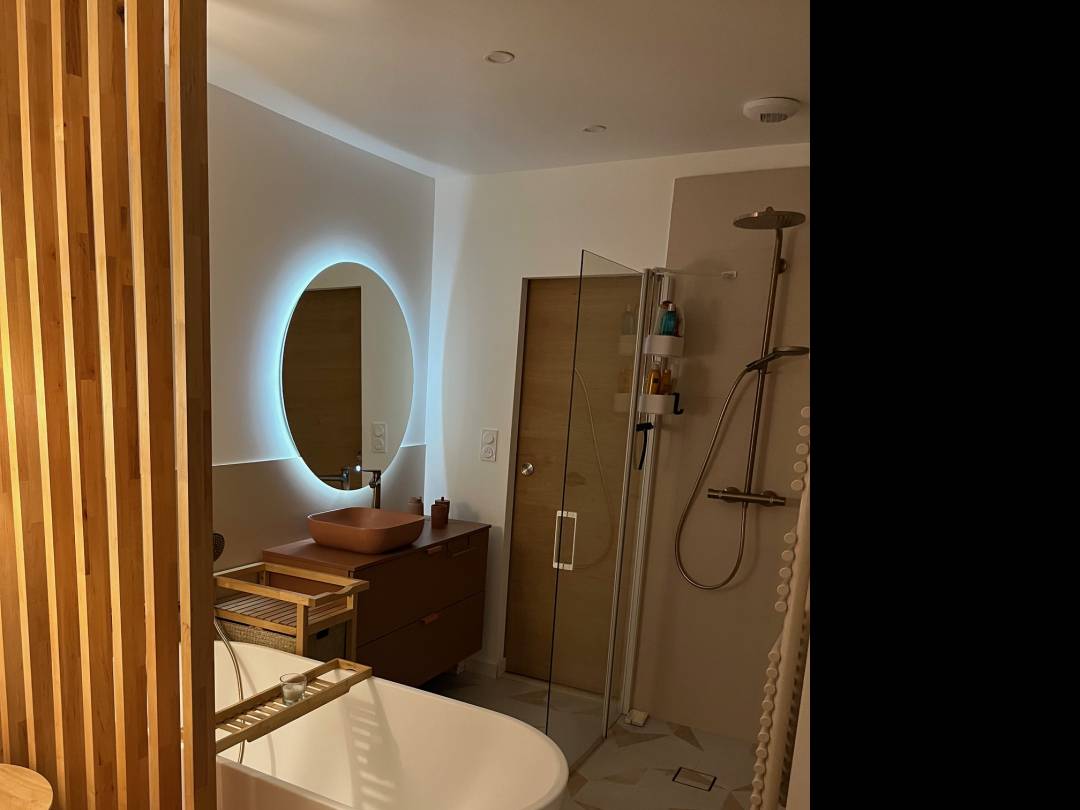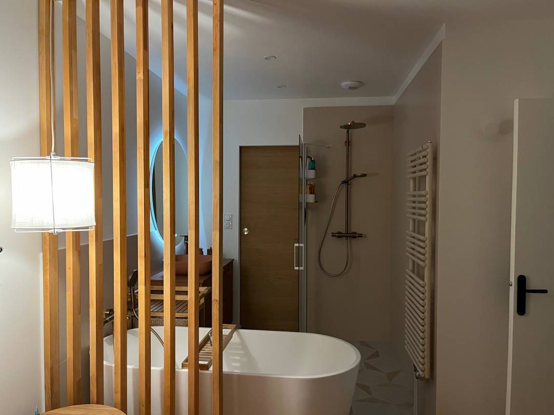 La séparation par une claustra bois isole l'espace salle de bain de la chambre tout en gardant une continuité visuelle.