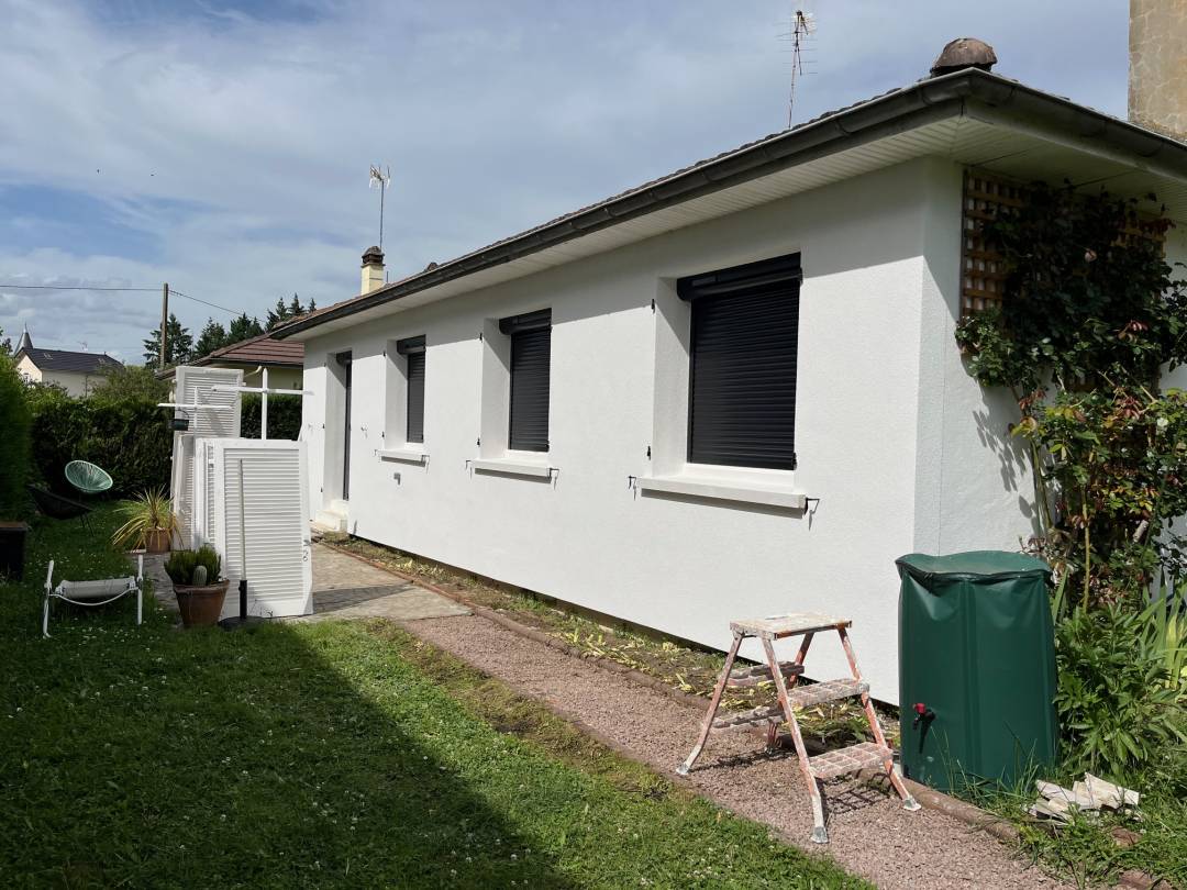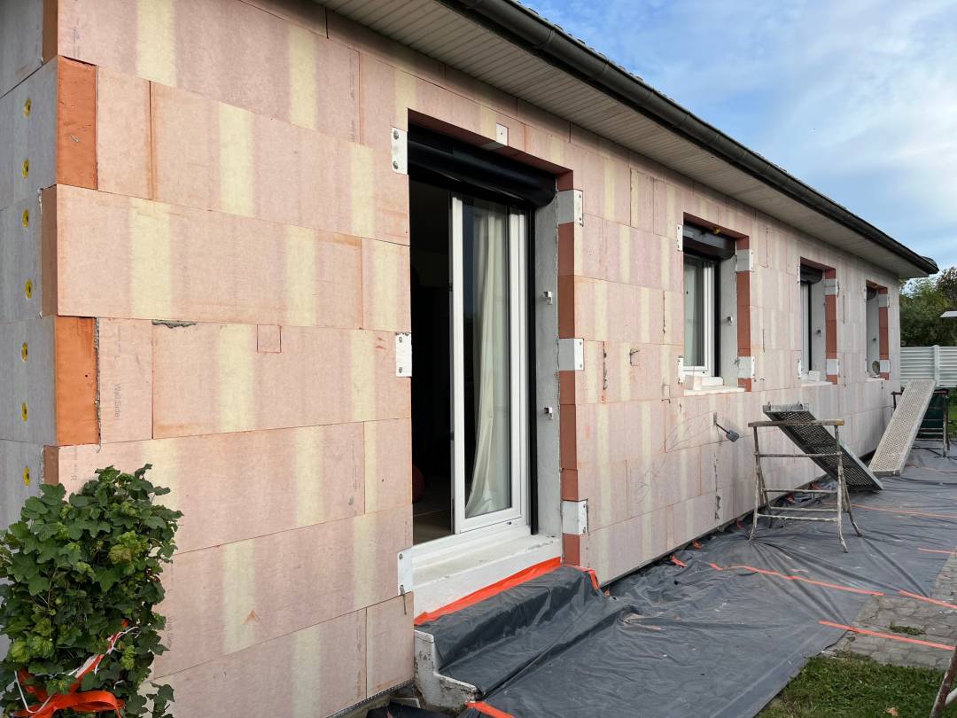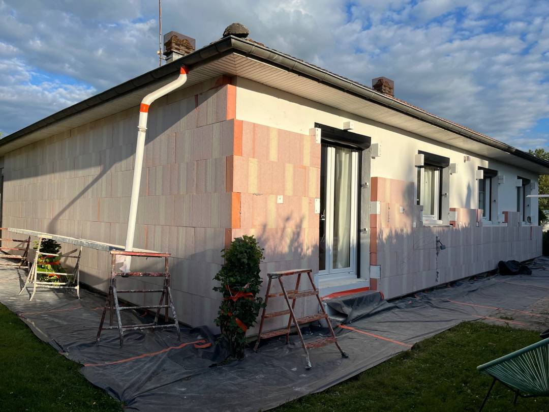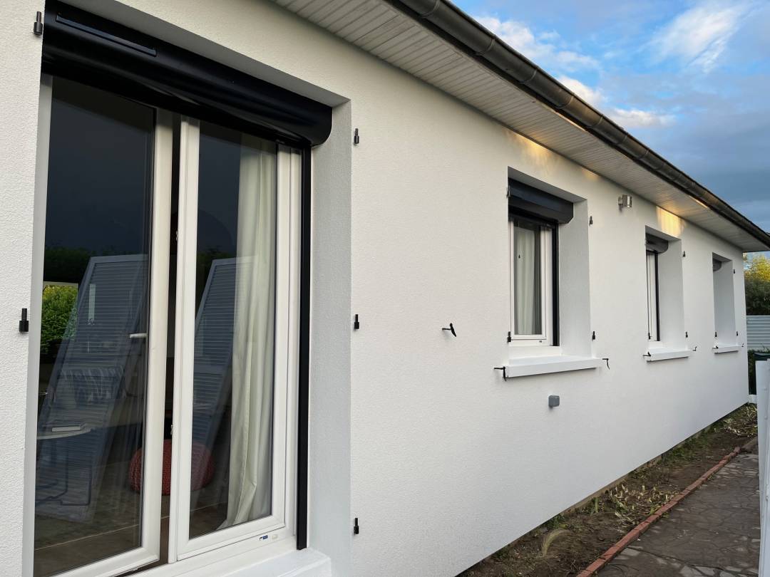 Pose d'une isolation extérieure sur maison de plain-pied, en panneaux RESOL de 120mm coef R=5,45 Repose des volets bois existants, nouveaux gonds et enduit de façade blanc dito existant. Ce projet a bénéficier des subventions Ma Prim Rénov 21000€ TTC sans les subventions Ma Prim Rénov ( montant des remboursement non communiqué )
