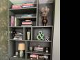 Aménagement et décoration d'un salon salle à manger, pose de papier-peint, réalisation d'une bibliothèque et meubles de rangements.