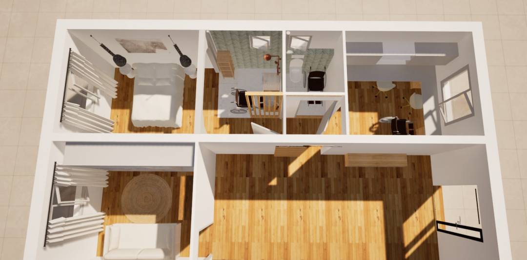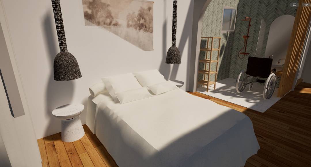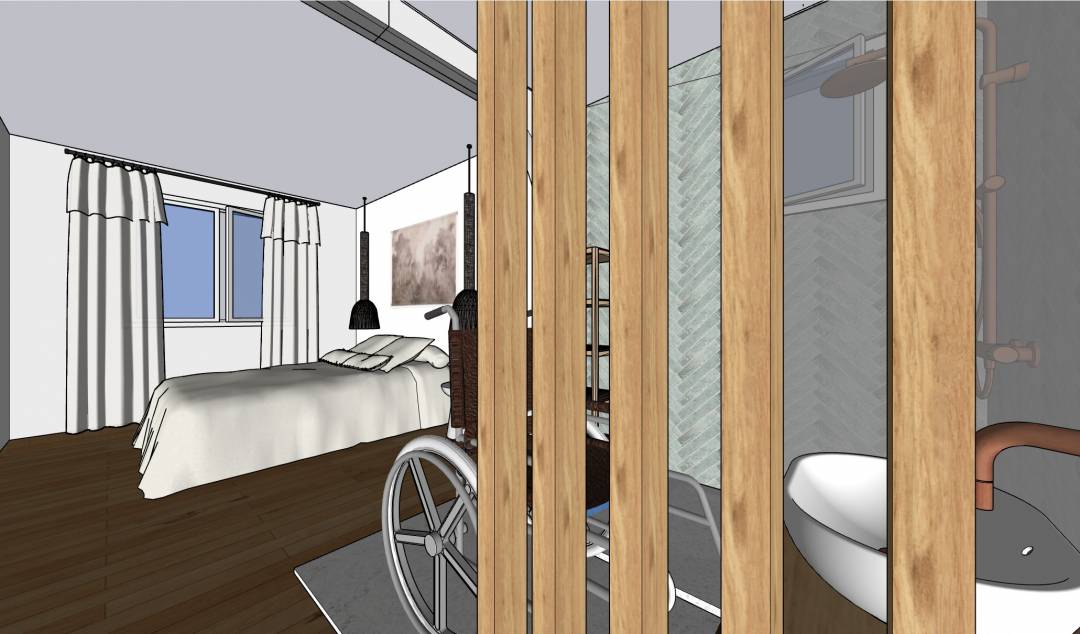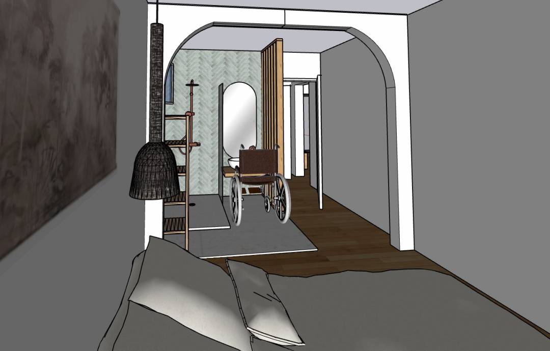 Le client souhaitait rénover le rez-de-chaussée de sa maison en espace accesssible pour personne handicapée. La mission a été d'agrandir la chambre, de transformer la salle de bain existante en SDB PMR ainsi que le WC. Les deux autres pièces ont été affectées l'une à un bureau et l'autre à une chambre supplémentaire et dressing. La cliente souhaitait un ambiance douce et féminine, des tons neutres et une salle de bain bleue.