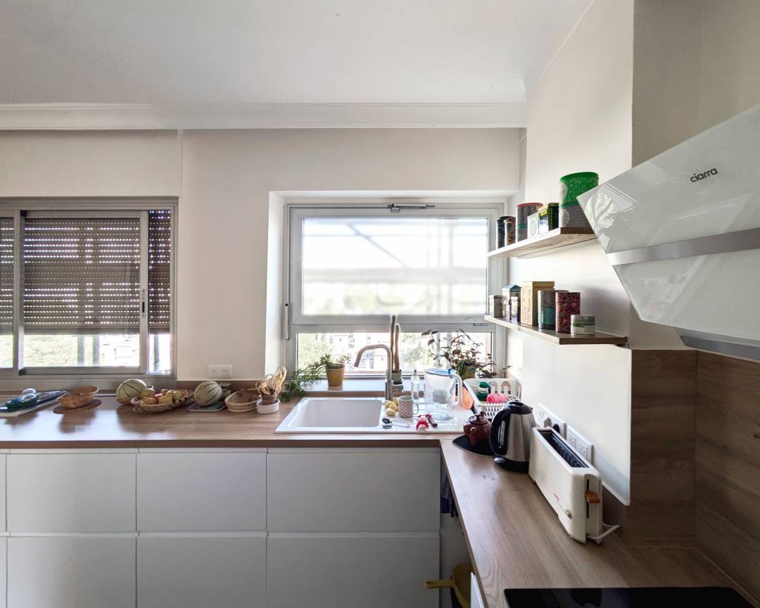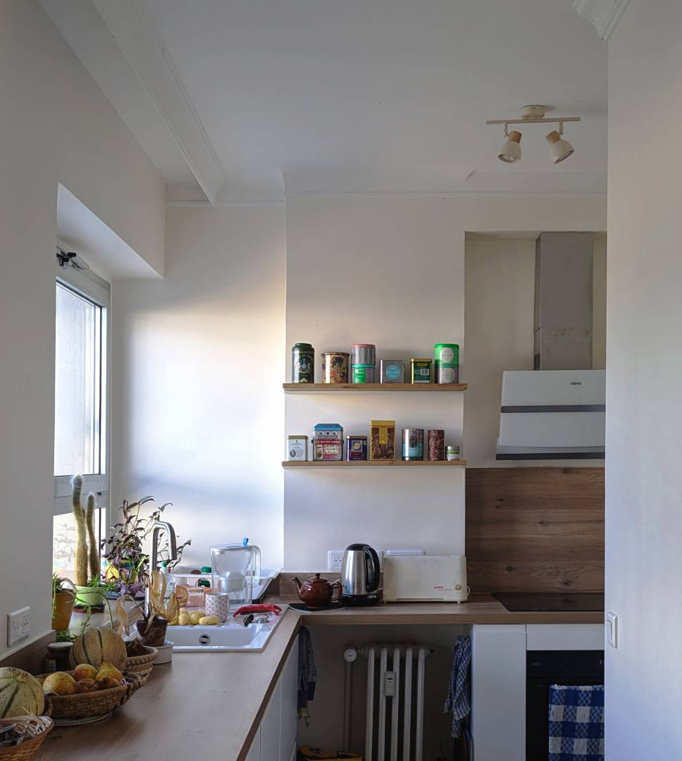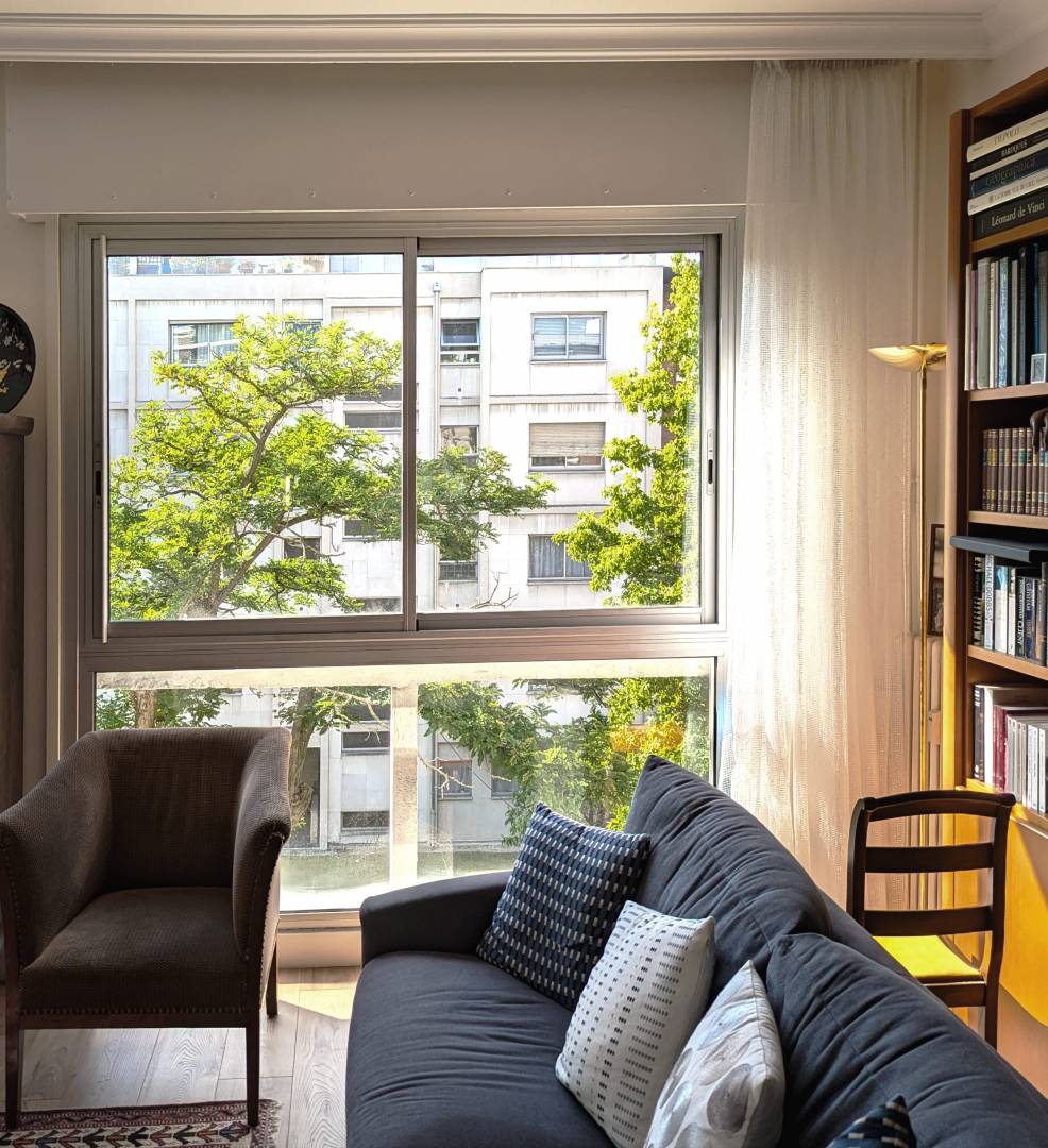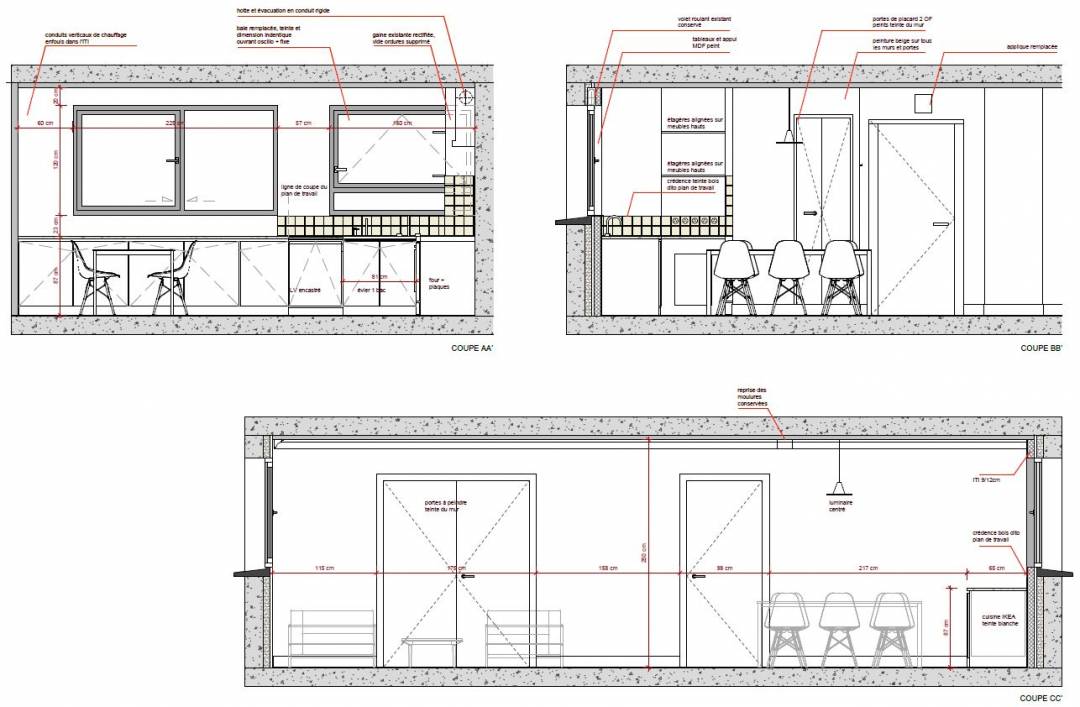 Rénovation partielle d'un appartement de 1950 avec la reprise de l'entrée, séjour, salle à manger et cuisine d'une surface de 45m² - Suppression d'une chambre et remplacement de l'ancienne cuisine, suppression d'une cheminée et du vide ordures - Isolation thermique intérieure et changement de menuiserie aluminium brut, ajout de volets roulants électriques - Reprise de l'électricité et des appareillages