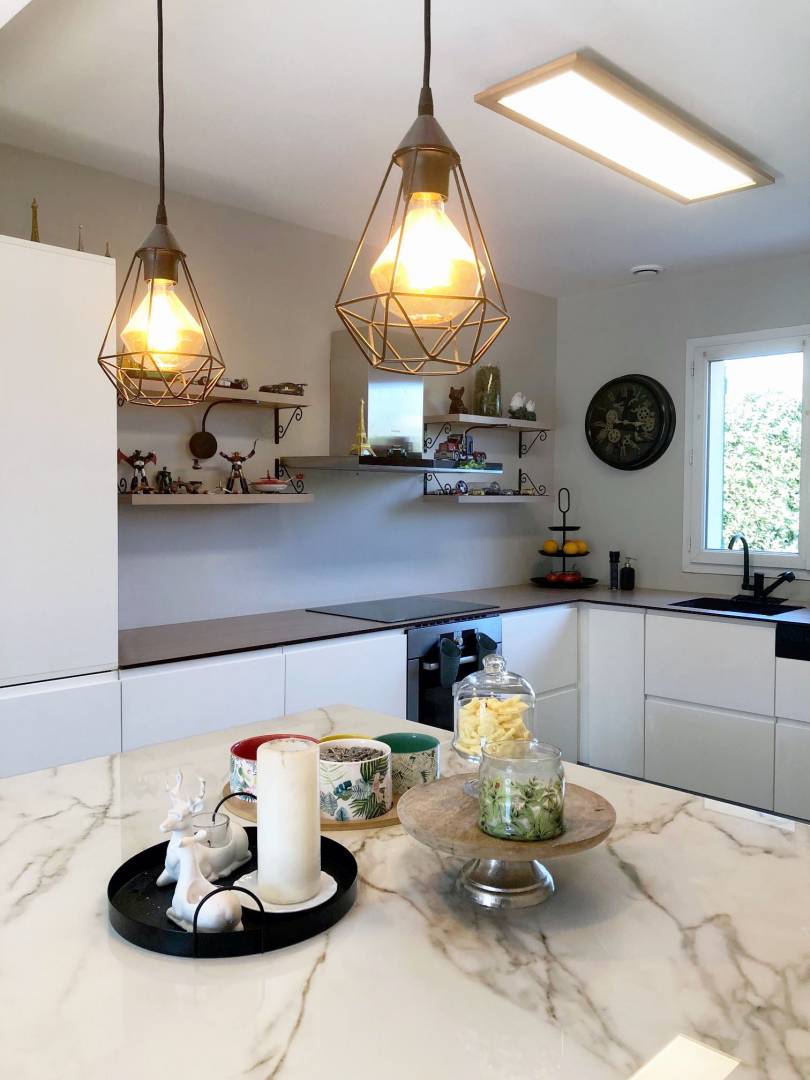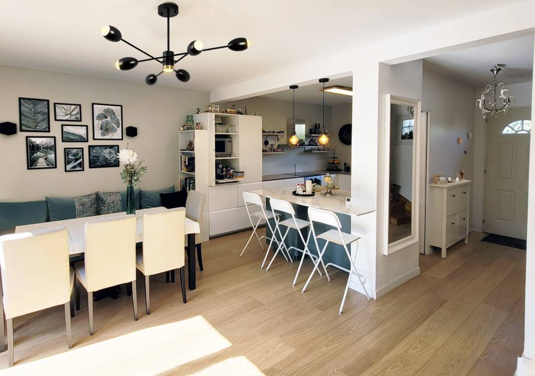 Pour ce projet, mes clients souhaitaient ouvrir la cuisine sur le séjour/salle à manger pour favoriser la luminosité et apporter de la convivialité. Au programme : abattement d’une cloison, installation d’une presqu'île fonctionnelle et intégration d’un aménagement sur mesure alliant esthétique et praticité. Cette nouvelle configuration apporte une touche de modernité tout en améliorant le confort au quotidien.