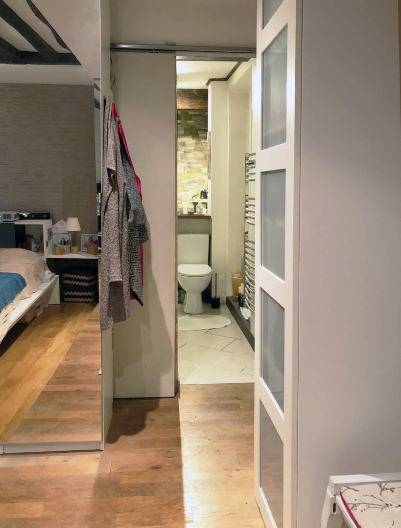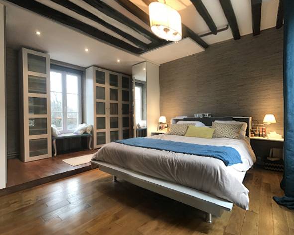 Création d'une chambre parentale. Abattement d'une cloison, création d'une ouverture sur la salle de bain attenante, réhaussement du plancher et installation d'un dressing. Le tout pour un espace chaleureux et fonctionnel, propice à la détente.