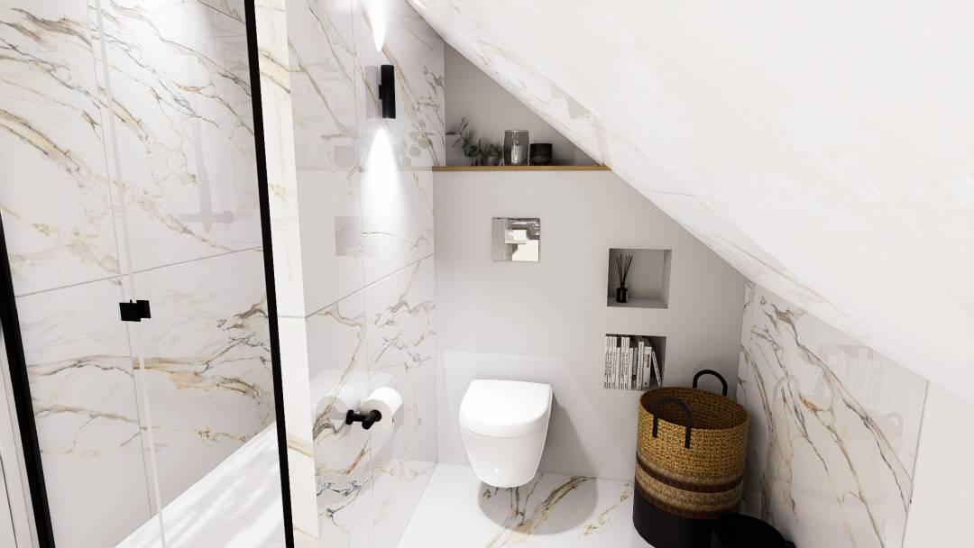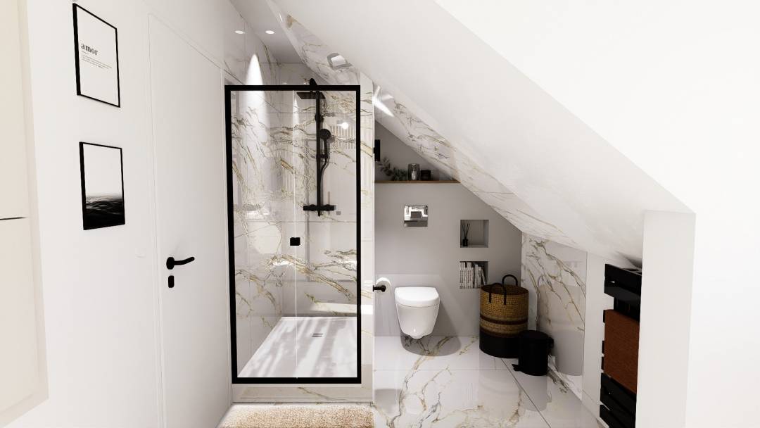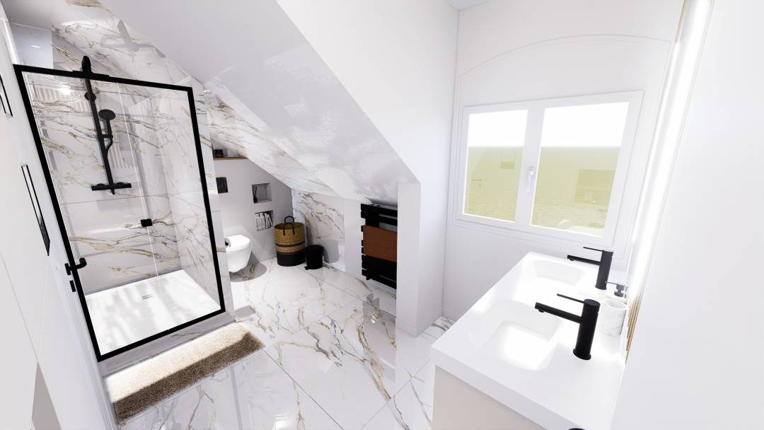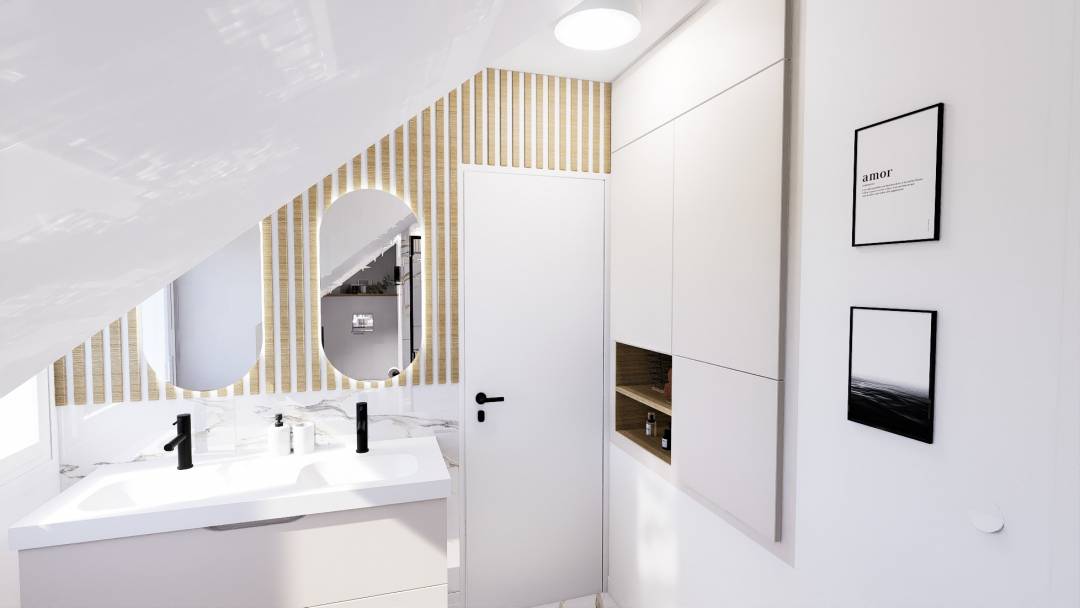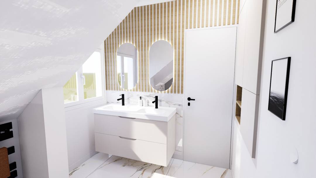La mission principale de ce projet était la modification de l'agencement de cette salle de bain classique, dans un style moderne, cosy, et épuré. Le défi était d'intégrer une douche, des WC suspendus, 2 vasques, et une zone de rangement, le tout dans un espace réduit sous combles.