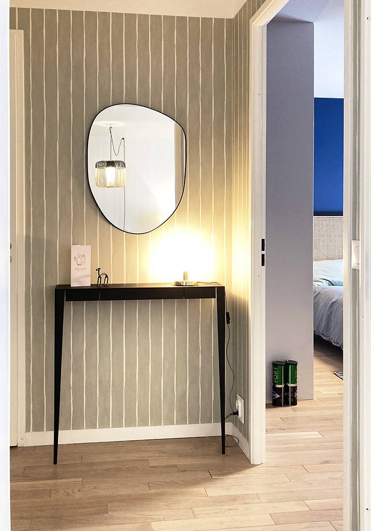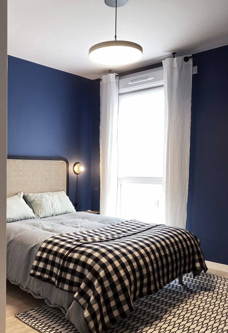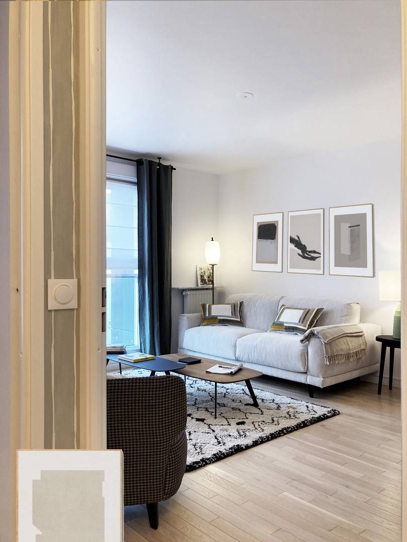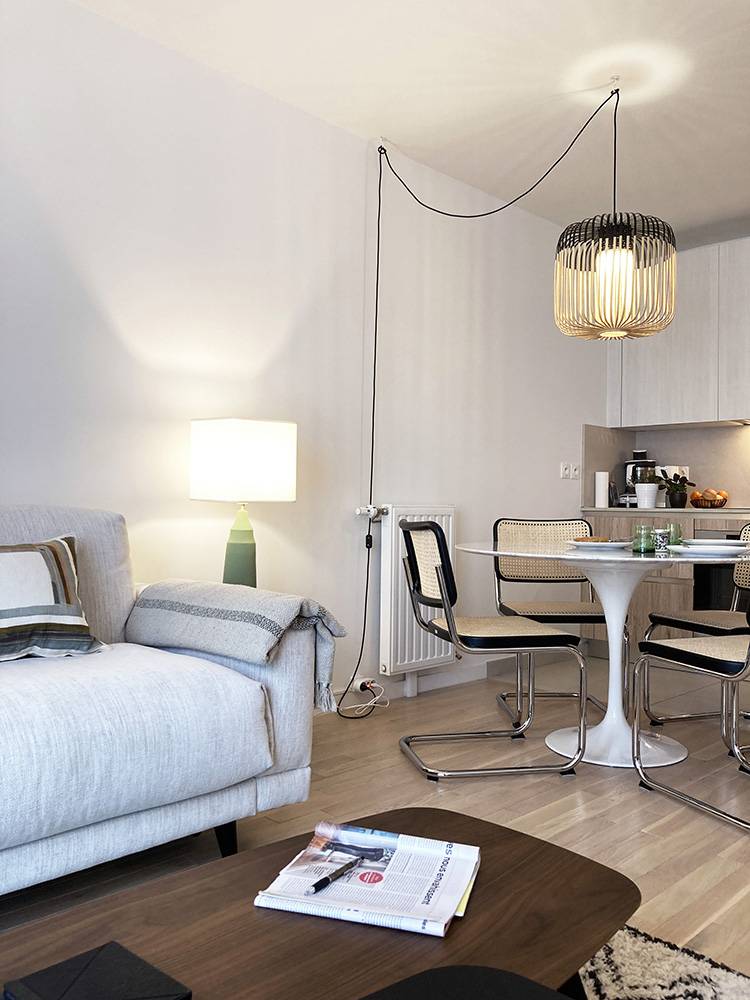 Décoration et ameublement de cet appartement de 50m2 neuf acheté sur plan, situé à Romainville. Pour le premier achat immobilier de notre client, un jeune quadra vivant seul, nous avons opté pour un style masculin, graphique et chaleureux.