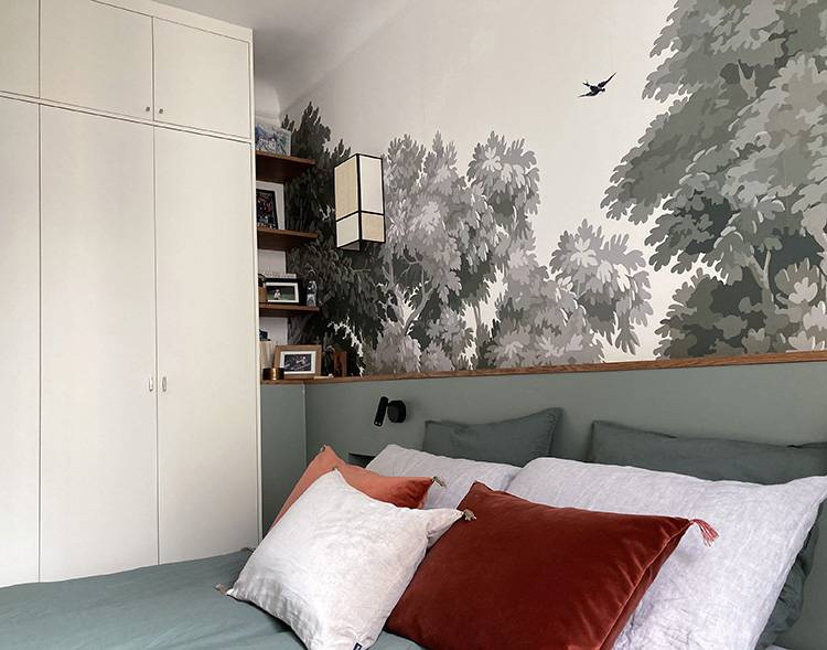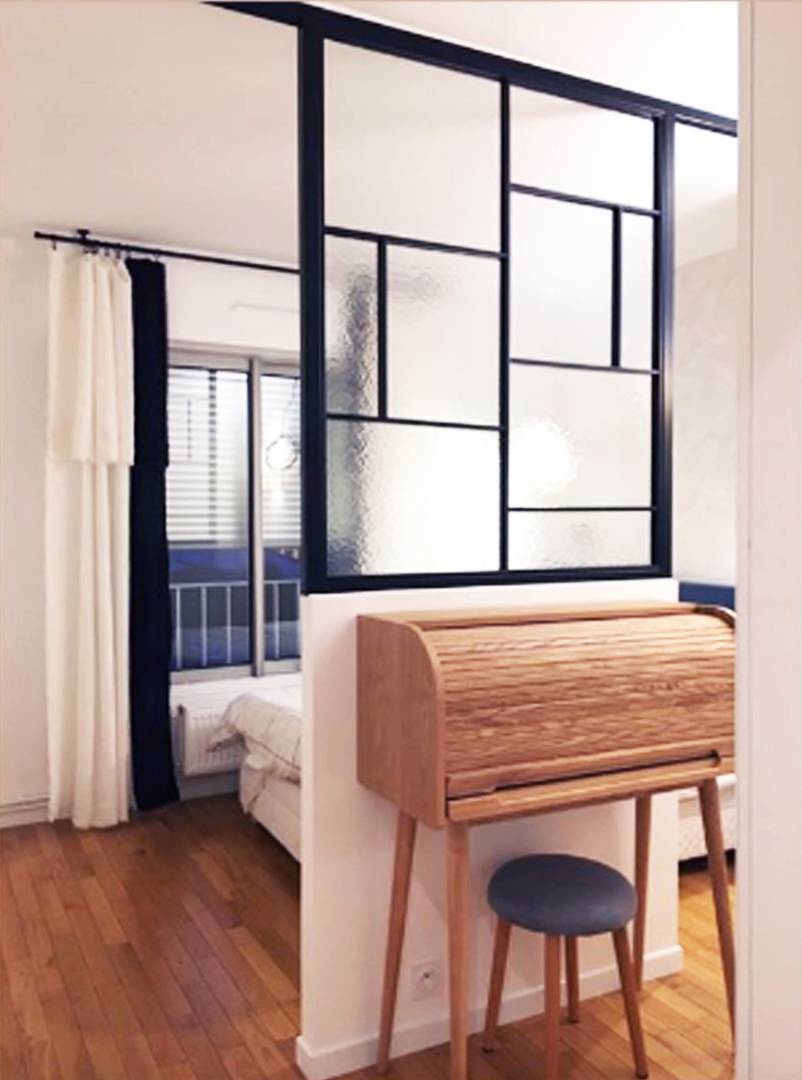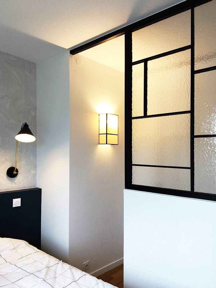 Appartement ancien de 70m2 situé dans le 16ème arrondissement Nous avons rénové les deux chambres à coucher. Comme beaucoup d'appartements haussmannien, il n'y avait pas de placards. Nous en avons crée un sur mesure. Dans la chambre parentale, nous avons crée une tête de lit et des chevets sur mesure dissimulant des tiroirs de rangement. Dans la chambre de la jeune fille, un espace dressing/bureau séparé de l'espace nuit par une verrière dessinée sur mesure.