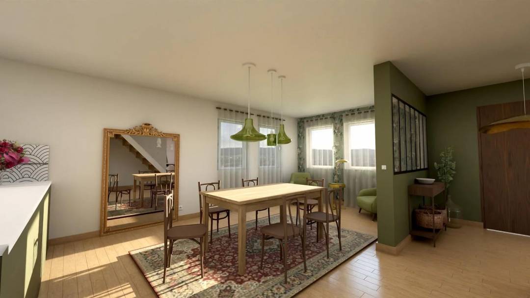 Repenser l'agencement afin de créer une salle à manger plus chaleureuse, ouverte sur une cuisine optimisée pour plus de fonctionnalité et des espaces de vie élargis. Le tout dans un style moderne/vintage.