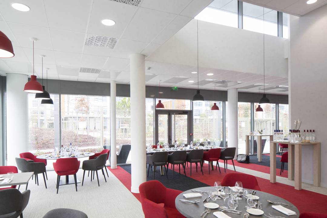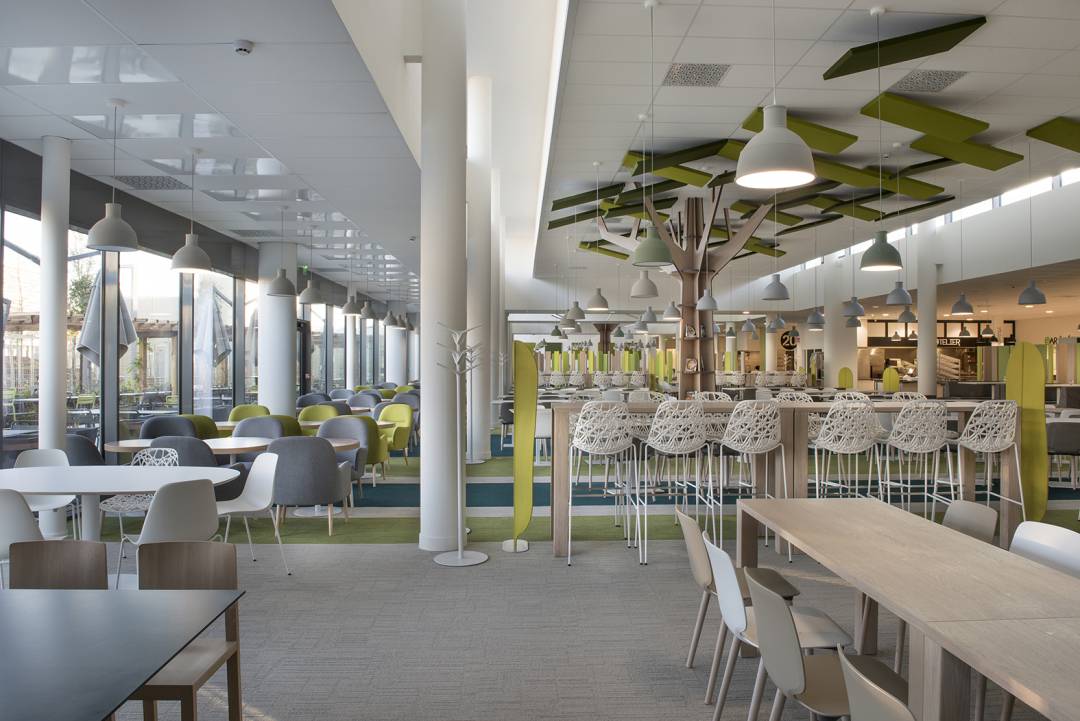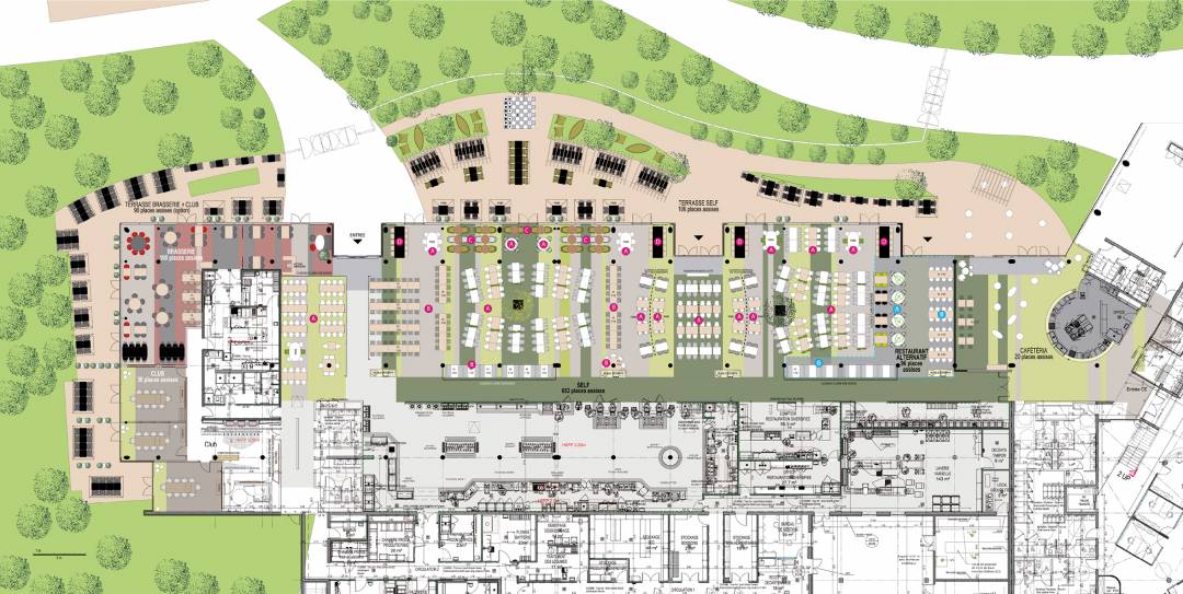 Conception et aménagement des salles de restauration : Self 653 places assises Restauration diversifiée 96 places assises Cafétéria 20 places assises Brasserie 100 places assises salons club 30 places assises Terrasse brasserie + Club 90 places assises (option) Terrasse self 106 places assises