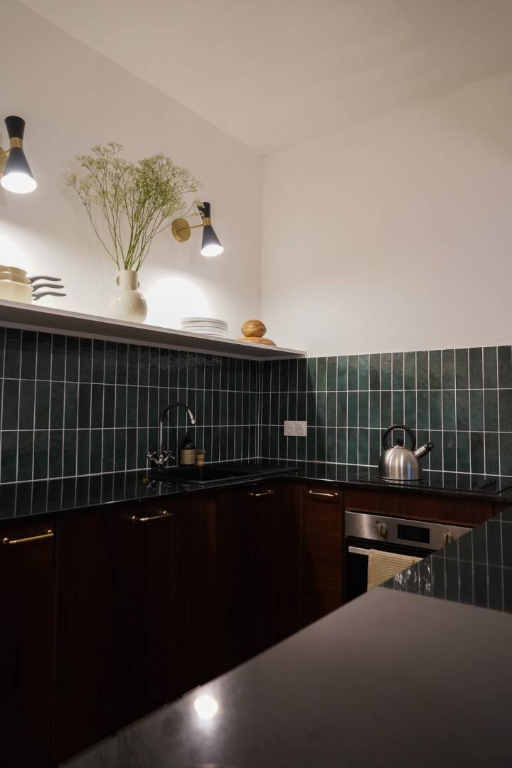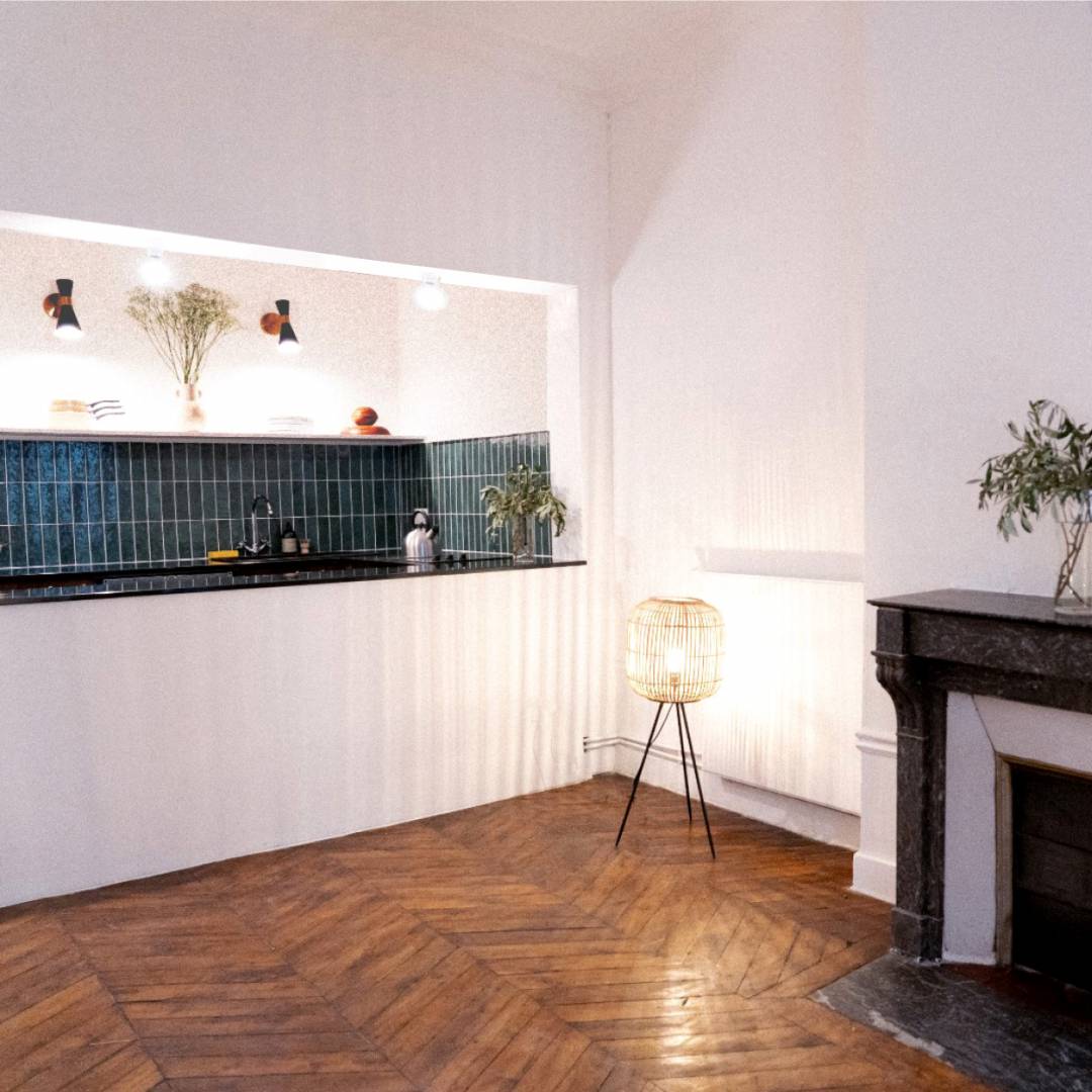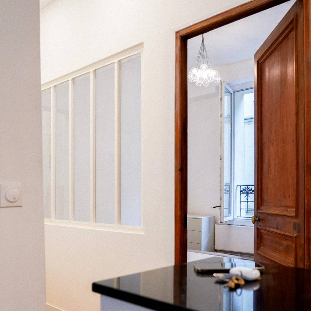 Un appartement de 40m2, dans le XVIIIe arrondissement de Paris qui n’offre pas un cadre de vie agréable et fonctionnel. Il possède pourtant des qualités indéniables : C’est un appartement traversant qui donne d’une part sur la rue et d’autre part sur la cour de l’immeuble. Sa pièce sur rue accueille un parquet, des moulures au plafond ainsi qu’une belle cheminée, les attributs d’un ancien séjour en enfilade. Le projet s’appuie sur les qualités existantes du logement : la création d'une cuisine ouverte agrandit l'espace et fait entrer la lumière naturelle. La création d’un axe dégagé de façade à façade ainsi que l’installation d’une verrière permet d’illuminer le couloir d’entrée. Ainsi la pièce sur rue, avec sa cuisine attenante, peut redevenir séjour, l’espace séjour-cuisine devient plus spacieux et fonctionnel. La chambre s’installe côté cour avec sa salle de bain, elle aussi baignée de lumière naturelle.