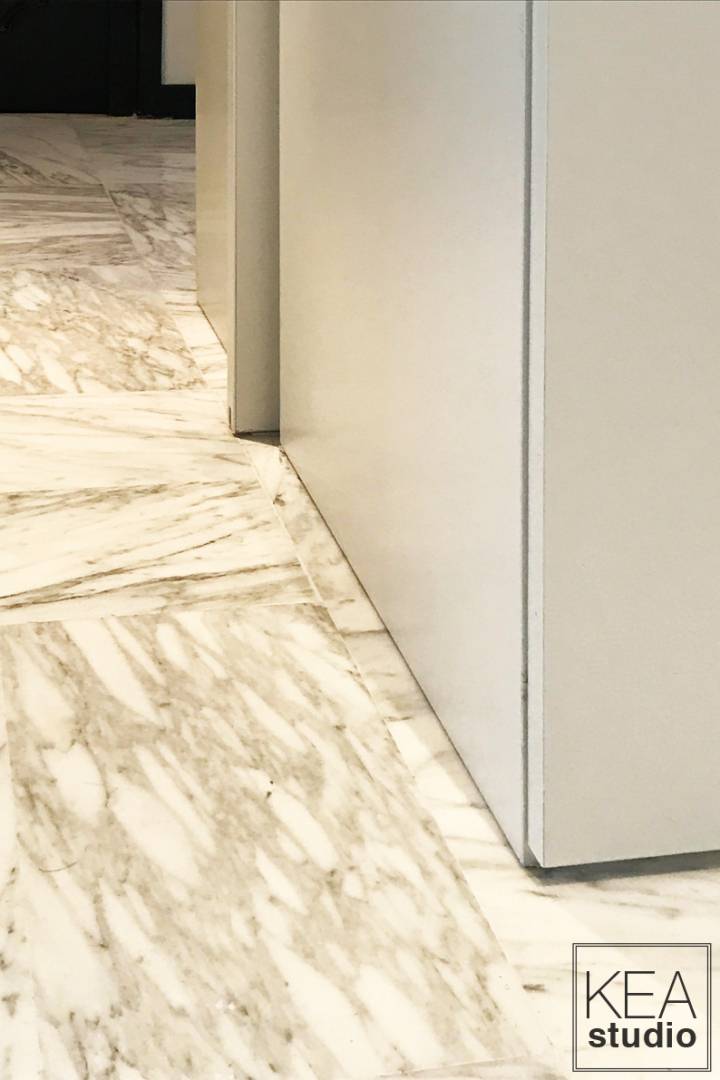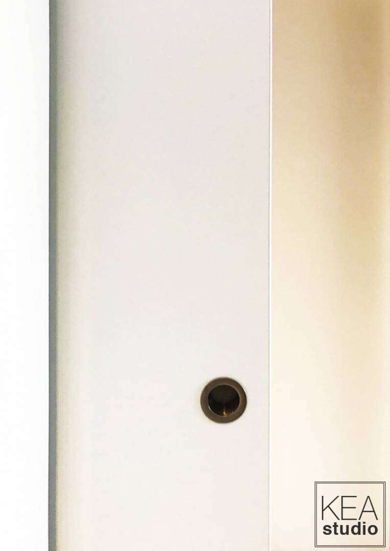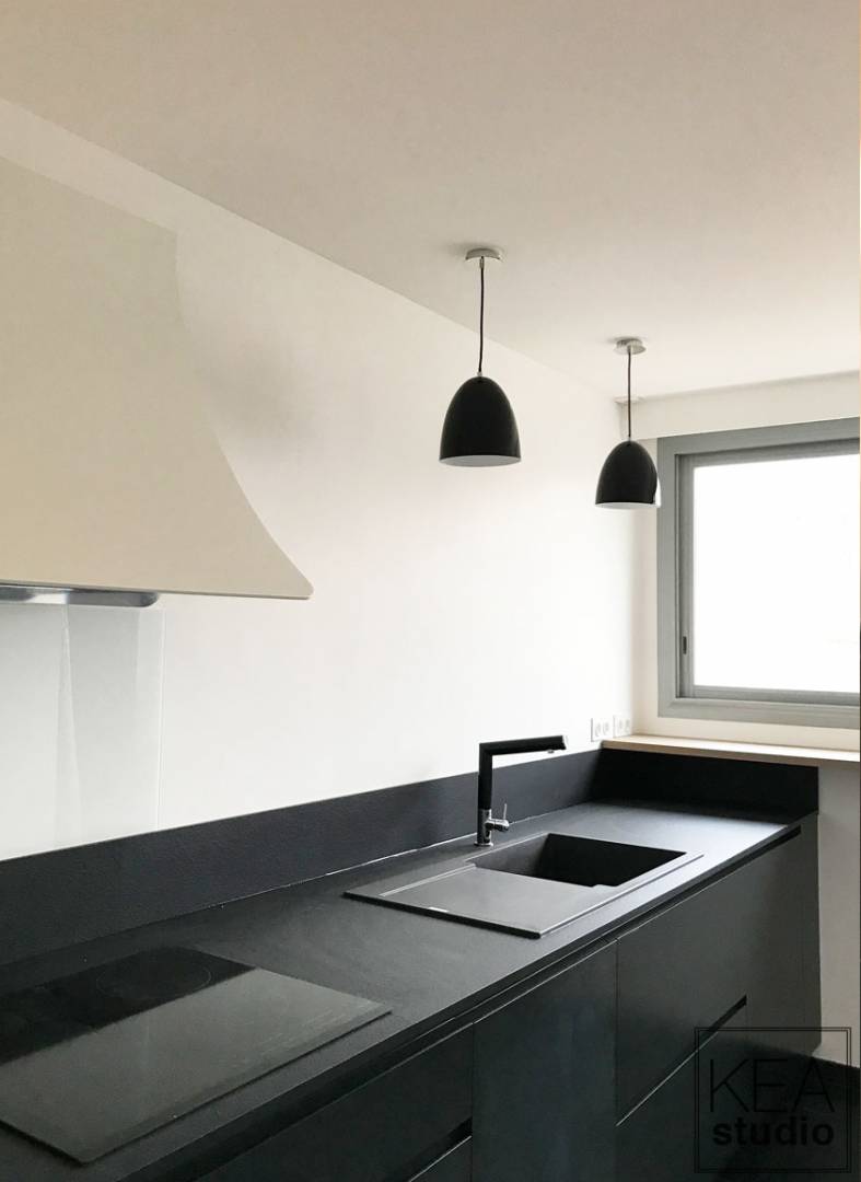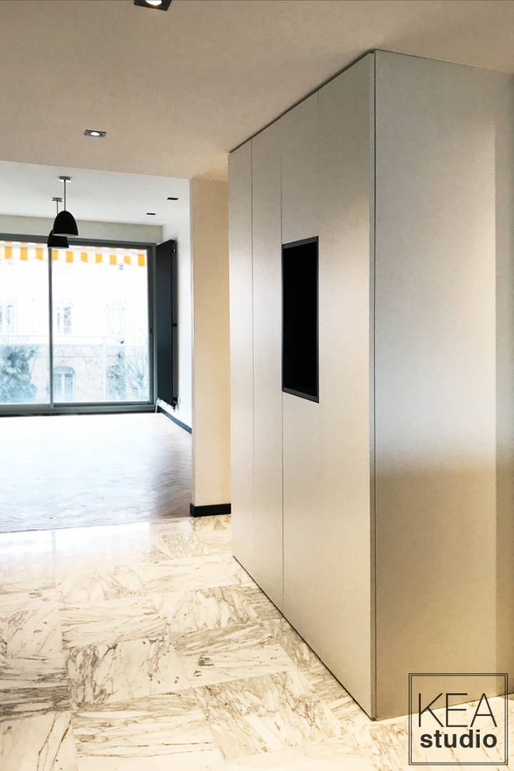 Ce logement très intéressant avait cependant un problème de répartition des espaces : un hall trop grand, une cuisine trop éloignée du séjour et des pièces de nuit donnant sur l'entrée... Ces problèmes ont été résolus grâce à un meuble central qui distribue et cloisonne les espaces de façon beaucoup plus cohérente et agréable. La cuisine est désormais fonctionnelle et facilement accessible par une ouverture bien plus large. Nous en avons également profité pour ajouter des éléments de confort indéniables : climatisation dans faux plafond, double vitrage, balcon carrelé, enceintes raccordées dans chaque pièce, etc.