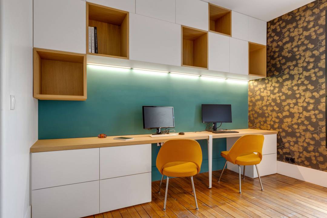 La pièce étant en longueur, il a fallu imaginer de part et d'autre, des espaces distincts sur chaque mur (dont un est fortement de biais). Le bureau a pris place naturellement sur le mur qui est droit afin de créer des rangements sur mesure en dessous et au dessus de l'immense planche de bois qui sert de bureau pour au moins deux personnes.