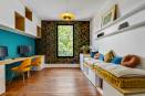 Sur le mur en face, une banquette créée également avec des rangements permet à la famille de venir lire au calme. De nombreux coussins viennent apporter une touche de douceur et de confort. Pour disposer toutes les photos, des tablettes de présentation ont été accrochées au mur.