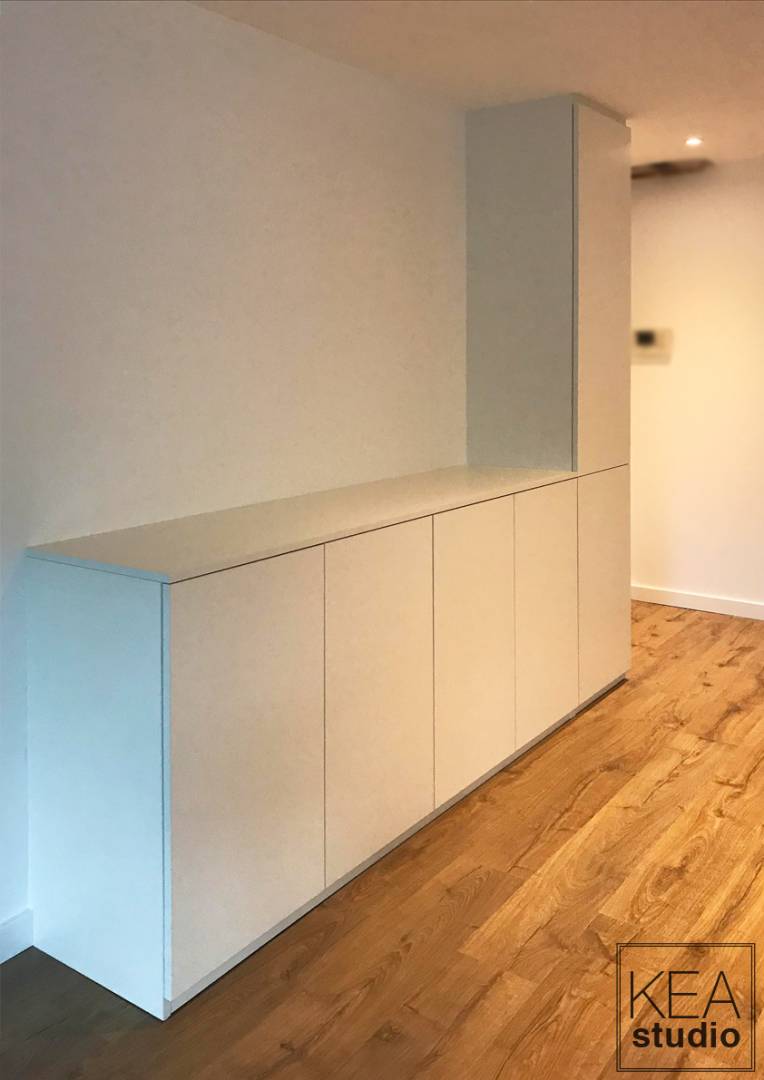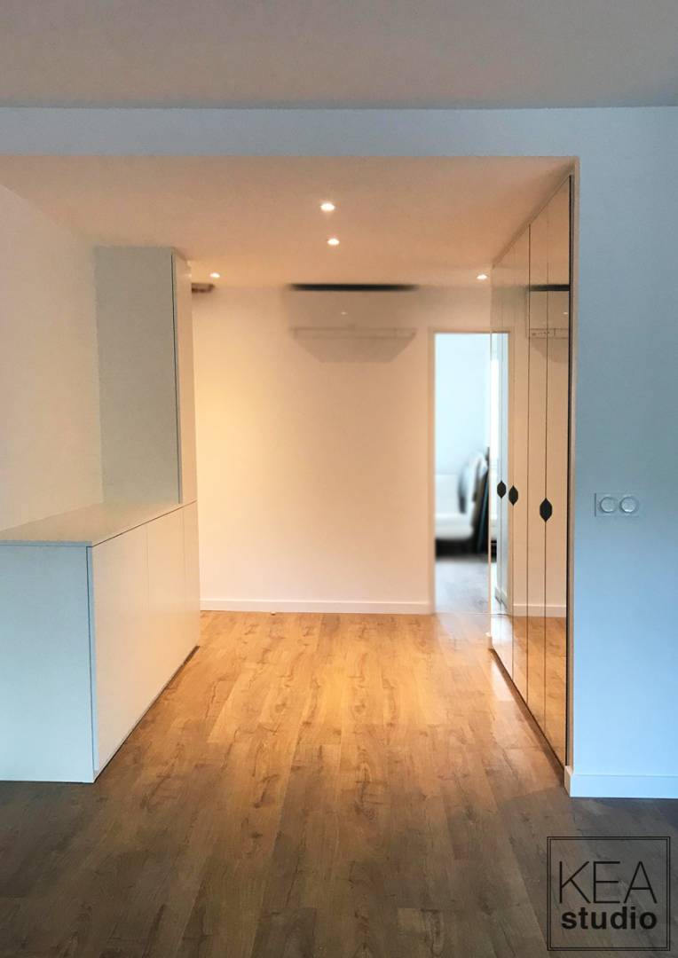 L'objectif premier était de réaménager tout l'appartement et de créer une grande pièce de vie comprenant salon, salle à manger et cuisine. Tout l'appartement est traité avec des couleurs claires et pures afin de laisser la liberté aux propriétaires de décorer à leur guise.