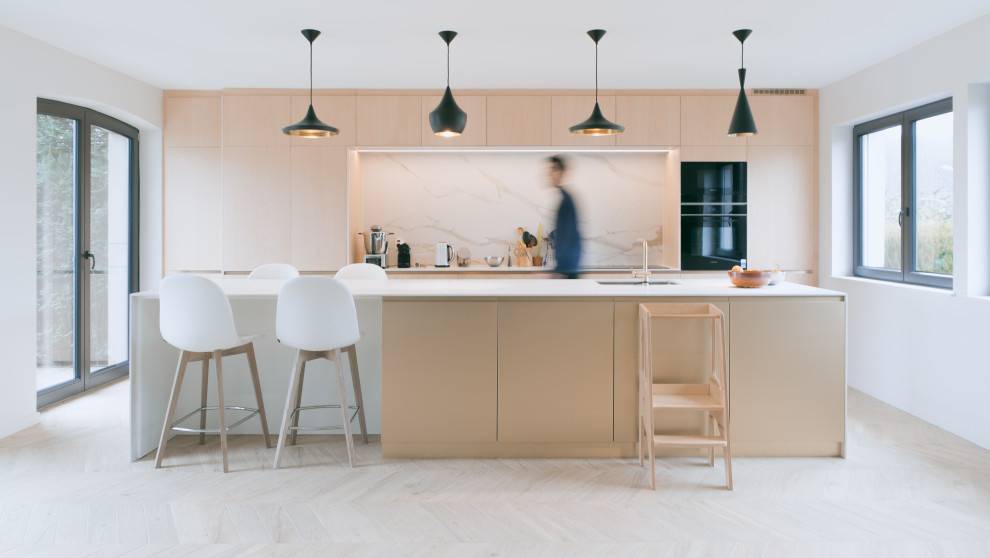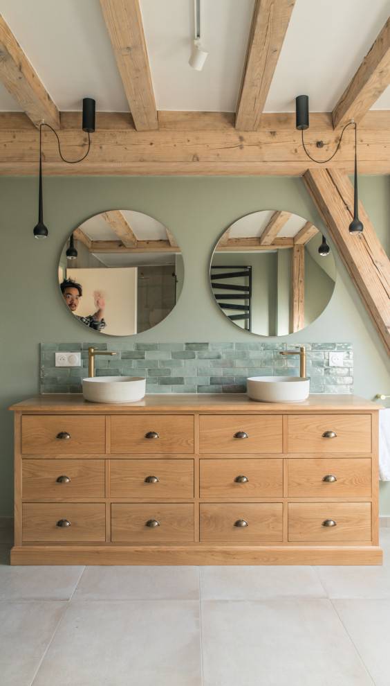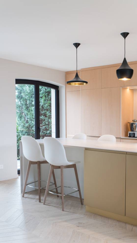 Rénovation complète d'une maison des années 70. Nous sommes ravis de vous présenter la récente rénovation d'une maison des années 70, un projet qui allie modernité, confort et respect du cadre de vie. Cette transformation complète a permis de redonner une nouvelle vie à un espace vieillissant, en intégrant des solutions modernes tant sur le plan énergétique qu'esthétique. Une transition énergétique vers la modernité L'une des principales transformations du projet a été le remplacement de l'ancienne cuve à fioul par une pompe à chaleur (PAC), offrant ainsi une solution de chauffage éco-responsable et performante. Couplée à l'installation de chauffage au sol dans les deux étages, la maison bénéficie désormais d'une chaleur uniforme et agréable, tout en réduisant son empreinte carbone et ses coûts énergétiques. Une nouvelle distribution des espaces Pour moderniser l'intérieur de la maison et lui offrir un agencement plus fonctionnel, nous avons procédé à des travaux d'ouverture d'espaces. Plusieurs murs porteurs ont été abattus, permettant d'ouvrir l'espace du rez-de-chaussée et de créer une grande cuisine ouverte. Ce nouvel aménagement favorise une circulation fluide entre les différents espaces de vie, et rend la pièce plus lumineuse et conviviale. Un espace de vie central autour de la cheminée L'une des caractéristiques remarquables de cette rénovation est l'articulation de l'ensemble de l'espace autour de la cheminée, un élément central et chaleureux. Pour accentuer ce point focal, nous avons intégré des niches et des étagères autour de la cheminée, permettant de créer une ambiance à la fois intime et moderne. La cuisine ouverte a été conçue dans un esprit de fonctionnalité et d'esthétique. Le choix de l'érable pour les meubles de cuisine apporte chaleur et authenticité à l'espace, tout en offrant une grande résistance au quotidien. Le plan de travail en Dekton, matériau haut de gamme, allie robustesse et design contemporain. Sa surface lisse et sans joints permet une grande facilité d'entretien tout en ajoutant une touche sophistiquée à l'ensemble. Un projet sur mesure pour une maison réinventée Ce projet de rénovation a permis de concilier les attentes des habitants avec des solutions techniques innovantes et un design soigné. En repensant l'agencement, en optimisant les performances énergétiques et en mettant l'accent sur des matériaux de qualité, nous avons créé un lieu de vie agréable, moderne et respectueux de l'environnement.