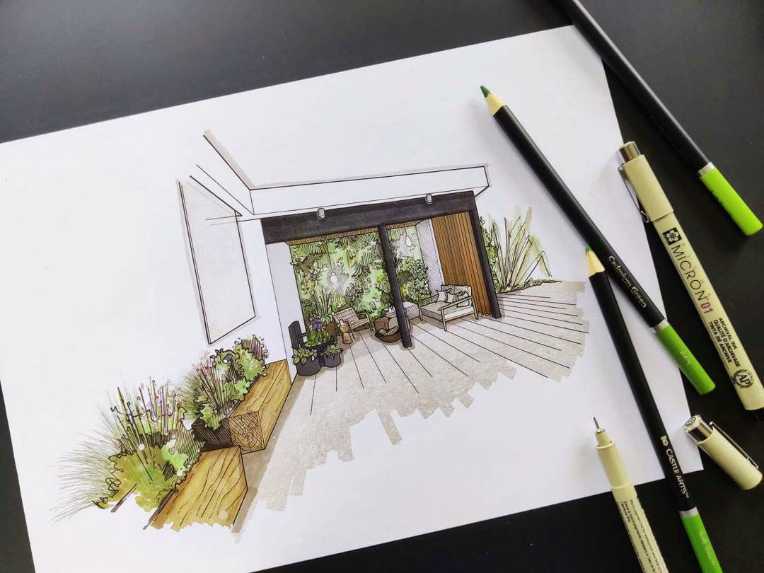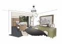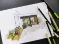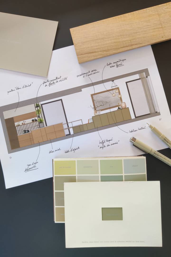 Aménagement extérieur d’un pool-house, rénovation d’un espace cuisine/séjour/salle à manger. Les clients désiraient ici retravailler les pièces de vie, afin qu’elles communiquent visuellement ensemble tout en créant un espace chaleureux aux teintes douces. L’idée était de rompre avec l’aménagement existant symétrique et ses teintes froides. Ils souhaitaient également travailler les volumes de la cuisine afin de dissimuler certaines zones techniques comme la zone d’eau et de cuisson. A l’extérieur, leur souhait était de pouvoir aménager la zone terrasse et le pool-house afin de pouvoir bénéficier à la belle saison d’espaces ombragés et frais invitant à la détente.