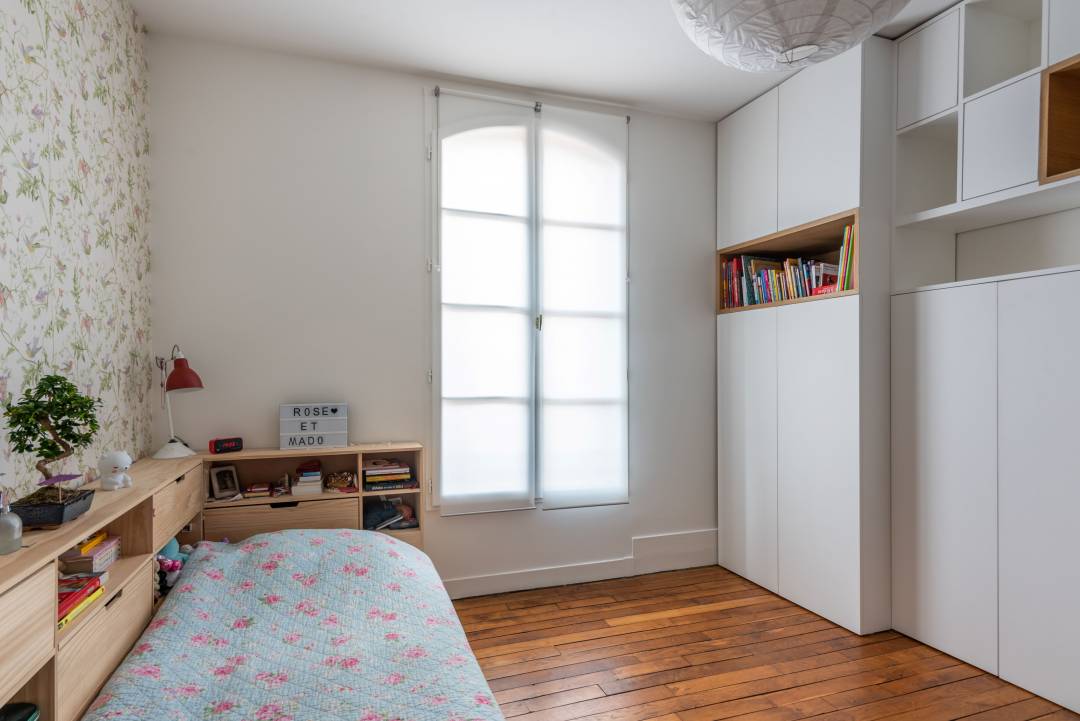 Dans une maison des années 30, la jeune fille de la famille manque cruellement de rangements dans sa chambre. L'idée est de créer des placards sur mesure qui intègre penderies et bibliothèques.