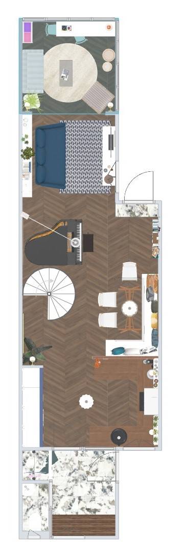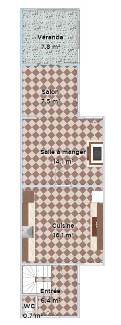 Bien que la structure de la véranda permettait d'en faire une pièce à part entière, celle-ci n'était pas isolée et était recouverte de simples plaques de fibrociment. L'autre aspect de la rénovation à prendre en compte était lié aux ouvertures. En effet, le plan de ce niveau étant en longueur avec des pièces en enfilade, les ouvertures n'étaient qu'aux extremités, m'obligeant à une réflexion poussée sur l'éclairage naturel de l'ensemble du logement. Le PLU ne permettait pas de créer d'autres ouvertures.