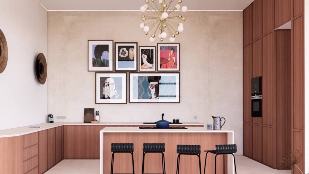 Aménagement et décoration d'un plateau vide d'une centaine de mètres carrés, incluant une cuisine, un salon, un espace repas.