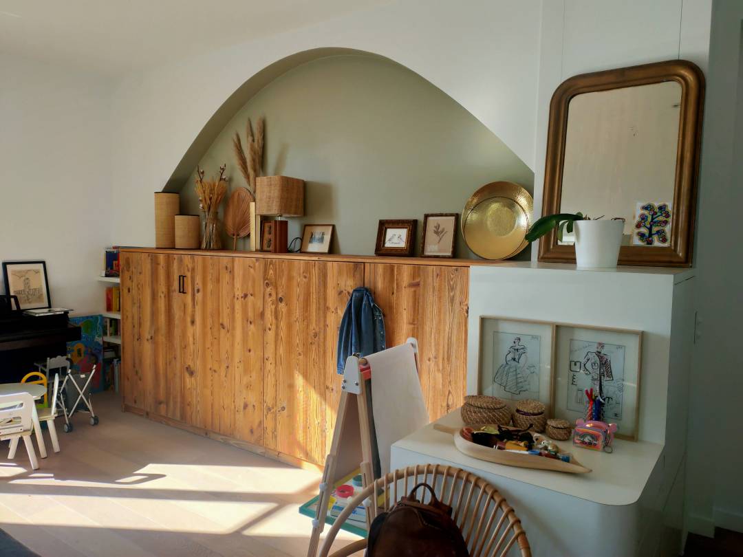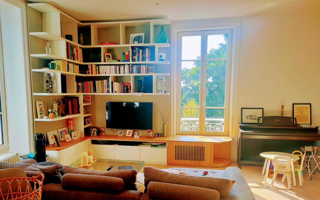 Rénovation d'un salon / séjour / cuisine avec création d'une bibliothèque sur mesure dans un bel appartement ancien pour une famille de 5 personnes. Objectifs : créer du rangement +++ pour cette famille, faciliter la circulation au quotidien, aménager des espaces adaptés pour chacun des habitants (petits et grands).
