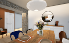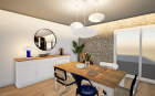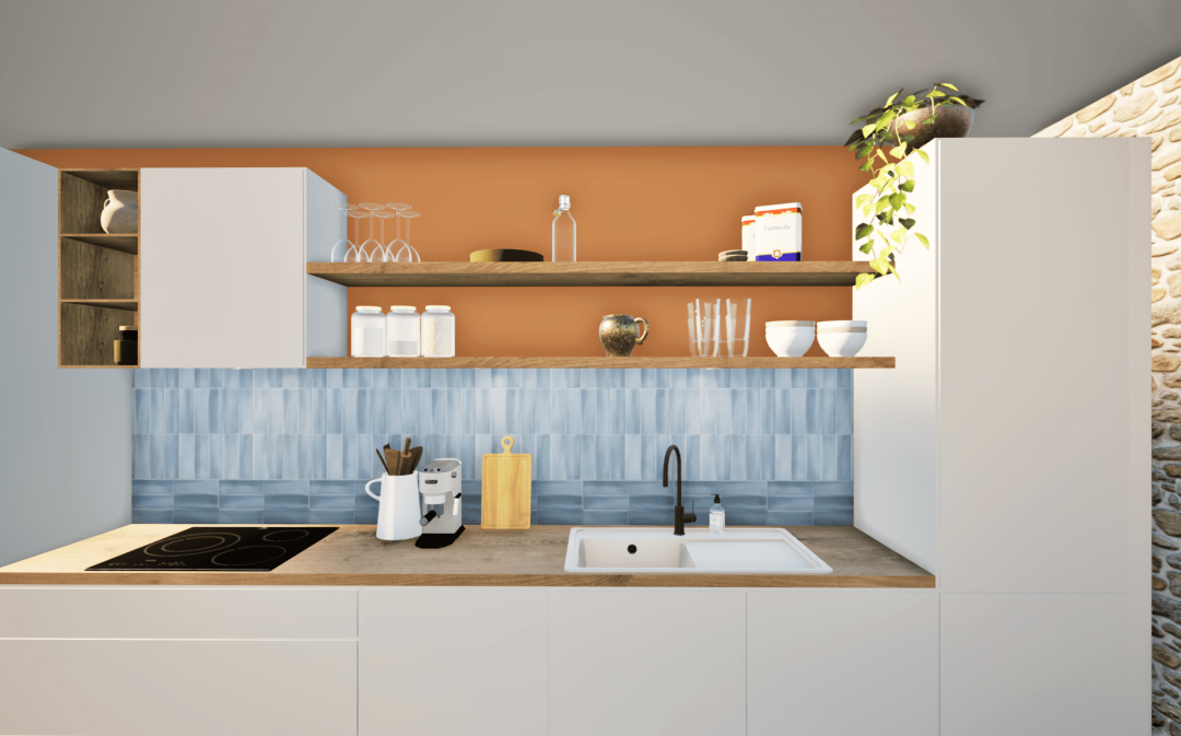 Mes clients voulaient moderniser leur cuisine sans pour autant perdre cet esprit chiné qu’ils apprécient tant. J’ai donc implanté une cuisine contemporaine, dans un coloris clair et sans poignées pour créer une ligne discrète. A cela, j’y ajoute une crédence en zelliges bleus pour apporter de la luminosité et des étagères en bois pour ne pas perdre la chaleur de la pièce de vie. Côté repas, je replace la table ancienne avec son plateau en chêne massif, que j’agrémente de chaises dépareillées aux styles bien différents. Le coin lecture se pare d’un ocre chaud pour amener de la profondeur à la pièce et faire ressortir le mur en pierres. Pour la décoration, j’ai amené des détails contemporains comme cette lampe à poser bleu électrique ou encore ces suspensions japandi, dans l’idée de créer le mix parfait entre ancien et actuel.