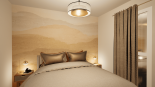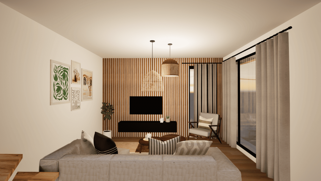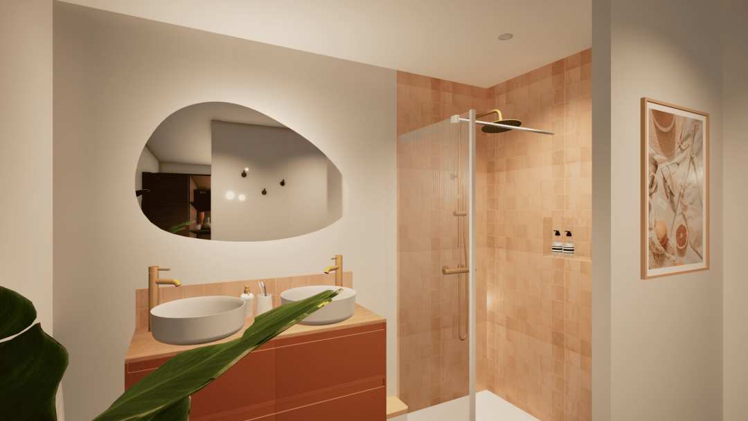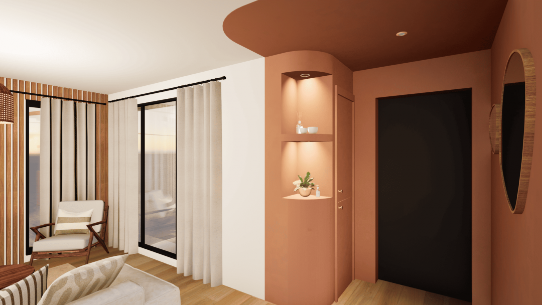 Dans ce projet, les jeunes propriétaires m’ont laissé carte blanche pour agencer et décorer les espaces ! L’idée était de créer de la vie dans cette maison qui sort tout juste de terre. Eviter les ambiances froides et trop minimalistes pour laisser la part belle à de jolies teintes pastels. Il a fallu optimiser les rangements en créant par exemple dans la cuisine un coffrage enfermant le réfrigérateur et intégrant la machine à café. Dans l’entrée, la courbe a été utilisée pour attirer le regard vers le salon tout en apportant un espace vide-poche. A l’étage, j’ai attaché un soin particulier aux détails de couleurs, de papier-peints, de mobilier, de textile et des luminaires pour une ambiance délicate et élégante.