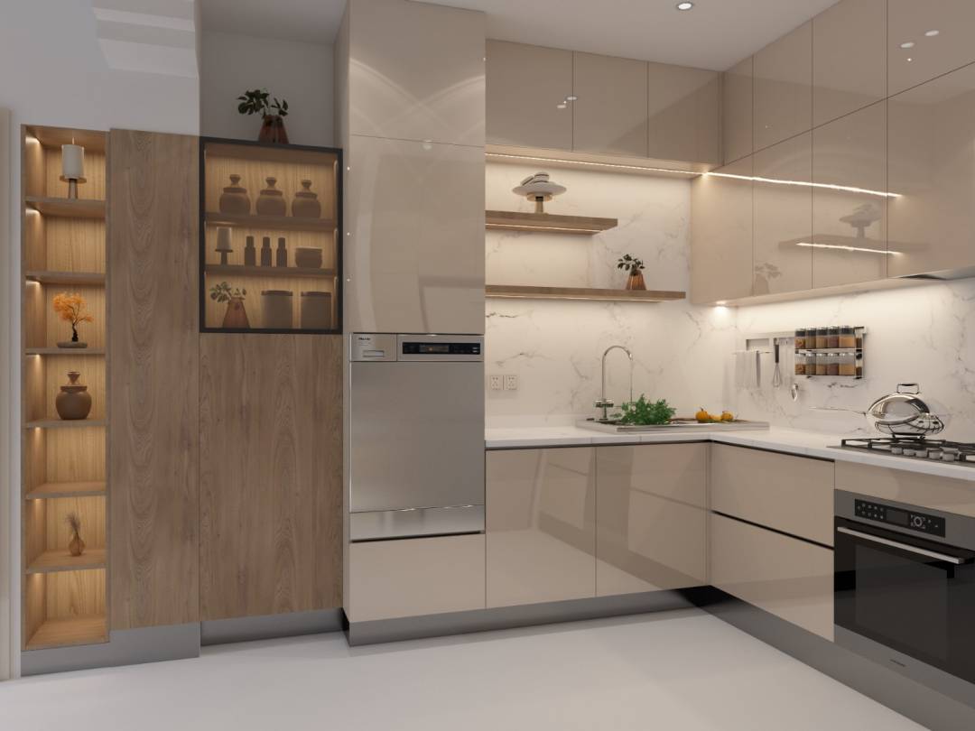 Ce projet de rénovation consistait à transformer une cuisine ancienne bâtie en une cuisine moderne, fonctionnelle et accueillante, tout en valorisant l’existant. L’objectif était de repenser entièrement l’espace pour offrir à ses usagers un lieu à la fois esthétique, pratique et chaleureux. La nouvelle cuisine se distingue par des façades en finition ivoire brillant, qui apportent une luminosité naturelle et un effet de grandeur à la pièce. Cette teinte claire et élégante reflète subtilement la lumière et modernise instantanément l’ambiance. Pour équilibrer cette brillance, des touches d’effet bois ont été intégrées au niveau des niches ouvertes et de certains panneaux verticaux, créant ainsi une atmosphère douce et conviviale. L’aménagement a été entièrement repensé pour optimiser les volumes, avec des rangements hauts toute hauteur, des coulissants bas ergonomiques, et un agencement fluide facilitant la circulation. Chaque détail a été étudié pour allier esthétique contemporaine et fonctionnalité du quotidien, dans un esprit sobre, naturel et intemporel.