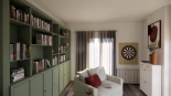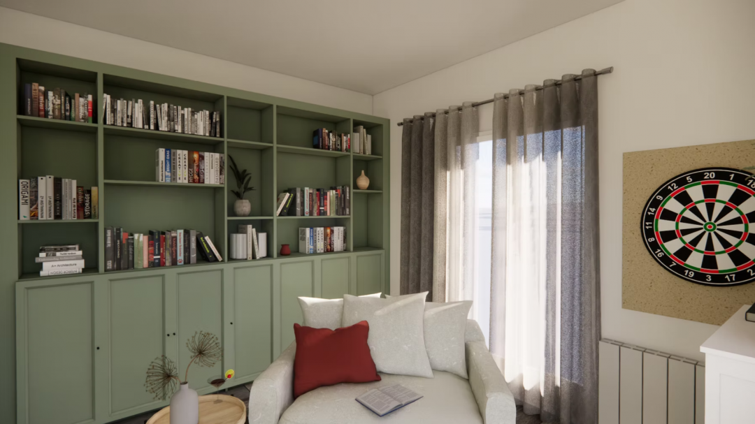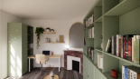 Ce projet de bibliothèque et bureau sur mesure associe élégamment le bois à une palette de couleurs naturelles et chaleureuses : terracotta, vert et lin.