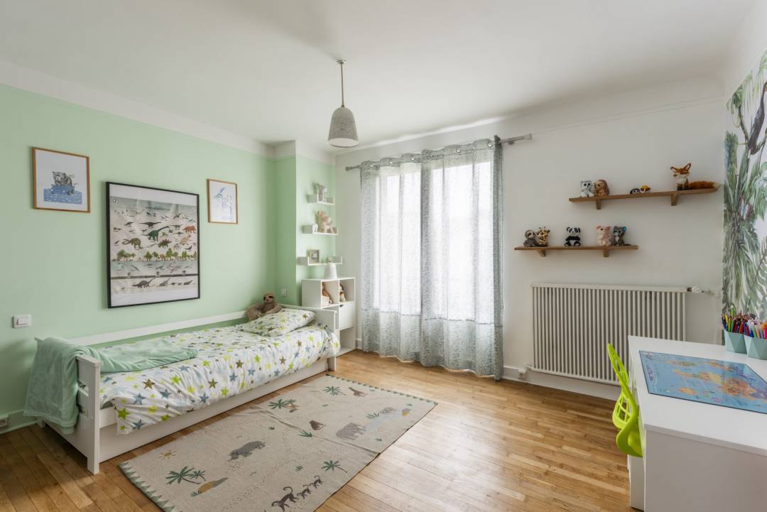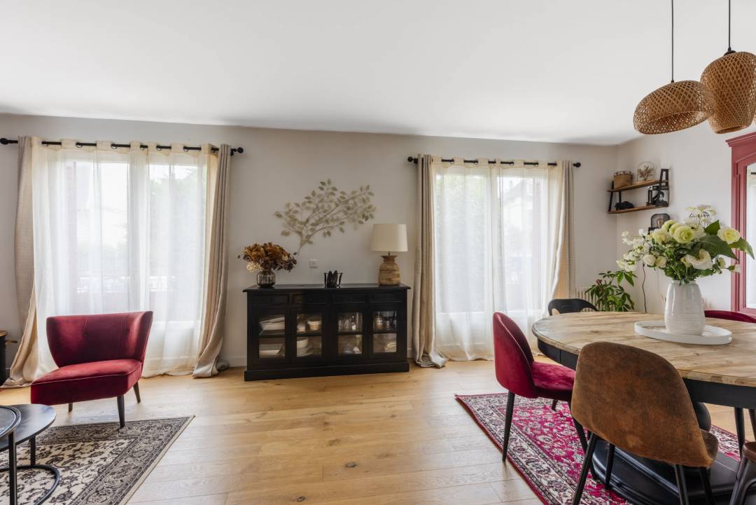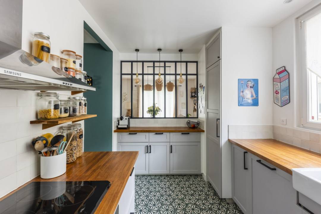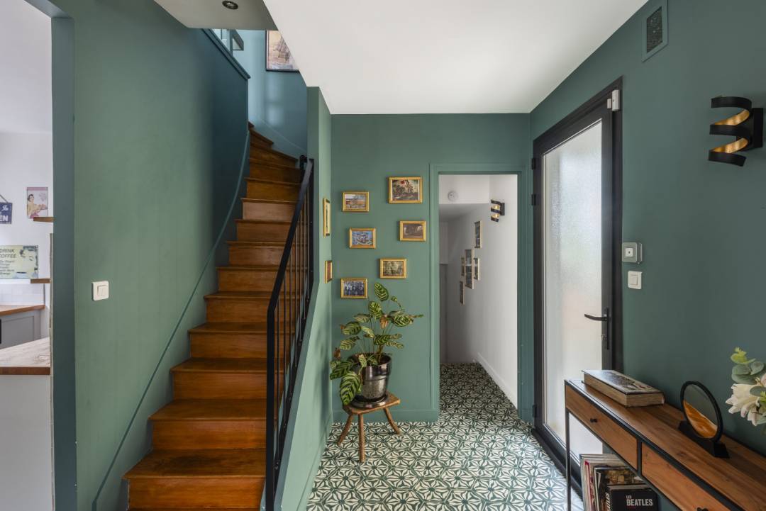 Maison à rénover en totalité en lui redonnant un côté moderne et chic tout en gardant une touche d’authenticité. Meulière des années 1930 de 150m2. Les besoins des clients étaient les suivants : Créer une séparation entre la cuisine et le salon/salle à manger mais en gardant un puit de lumière Créer du rangement dans la chambre principale Garder une baignoire dans la salle de bain des enfants Créer une entrée Tous les sols de la maison ont été remplacés, le choix du parquet et des carreaux de ciment a été approuvé. Ces deux matériaux combinés apportent une touche d’authenticité dans un décor plus moderne industriel. es couleurs choisies dans les pièces principales sont dans des tons assez soutenus et marqués, l’objectif était d’apporter un côté chic à la maison et créer un effet cocon. Les pièces de la maison plus petites sont dans des tons clairs afin de ne pas les rétrécir. Concernant la décoration, j’ai opté pour des meubles en bois sombre et du velours pour les assises qui apportent une sensation de réconfort. Des matières dans les objets de décoration comme le fer noir et le laiton ont été utilisées pour sublimer le style industriel.