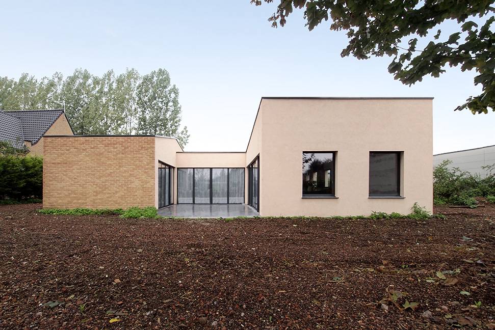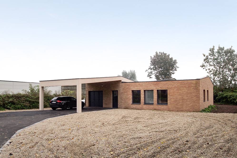 Conçue de plain-pied afin d’être intégra- lement accessible en fauteuil roulant, la maison se compose de trois volumes dont l’assemblage crée une forme complexe et imprime un rythme. Sous un toit à 3 pentes se logent un carport, la cuisine et le salon. Un petit volume doté d’un toit plat accueille ensuite un bureau-chambre d’amis, une salle d’eau et un WC séparé. Il fait la jonction avec la partie nuit, surmontée d’un toit à 2 pentes, dans laquelle ont été placées deux chambres et une salle de bains.