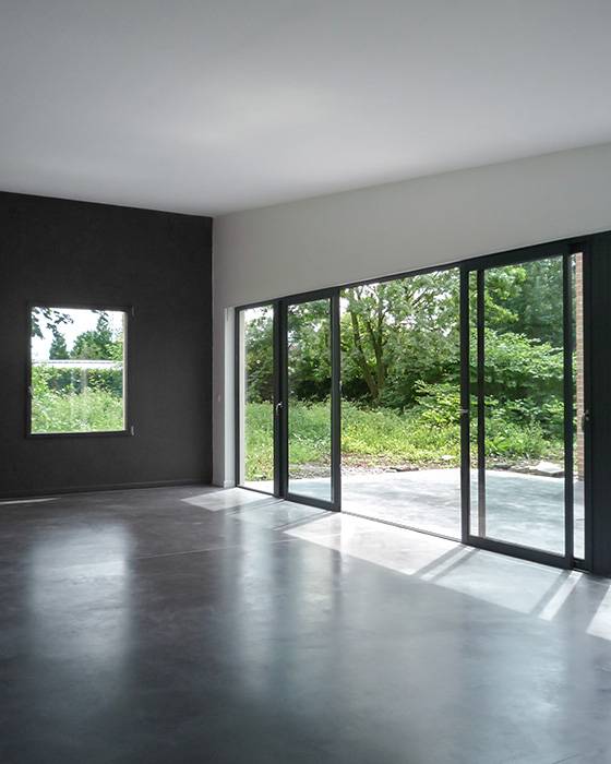 Se prolongeant jusque dans le patio, cette chape unifie l’espace, tout comme le métal noir des huisseries. Les baies vitrées ont pour leur part été sélectionnées pour leurs qualités thermiques : alliées