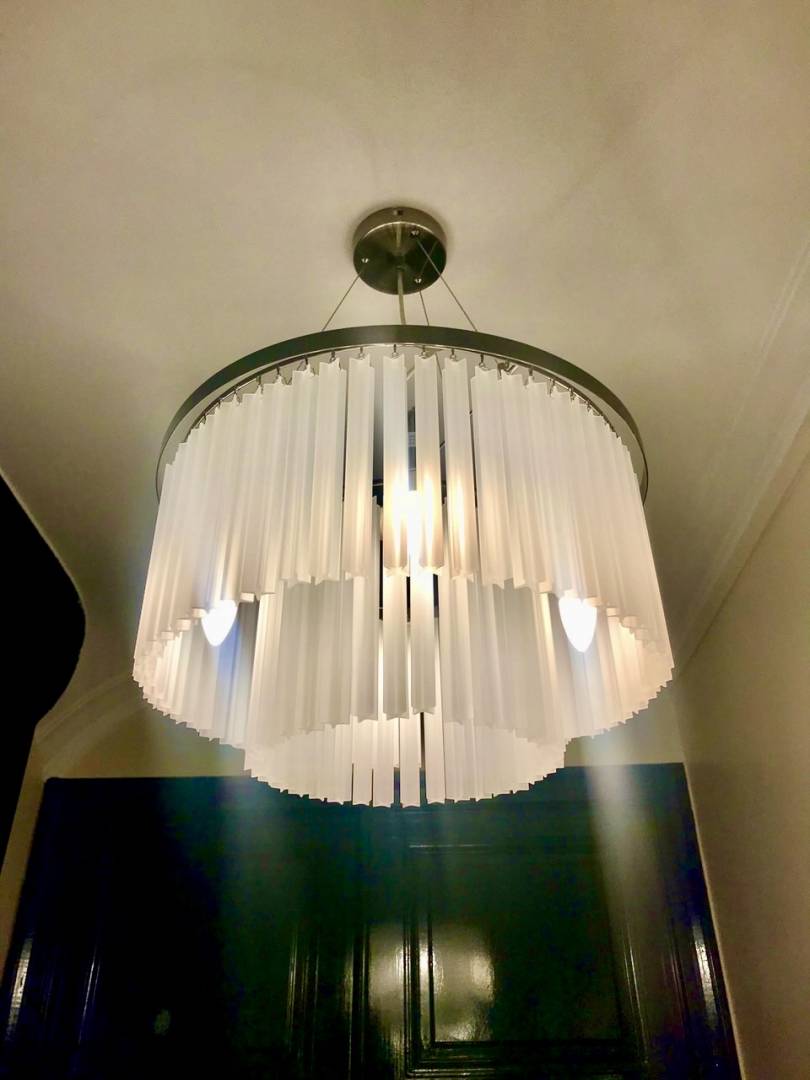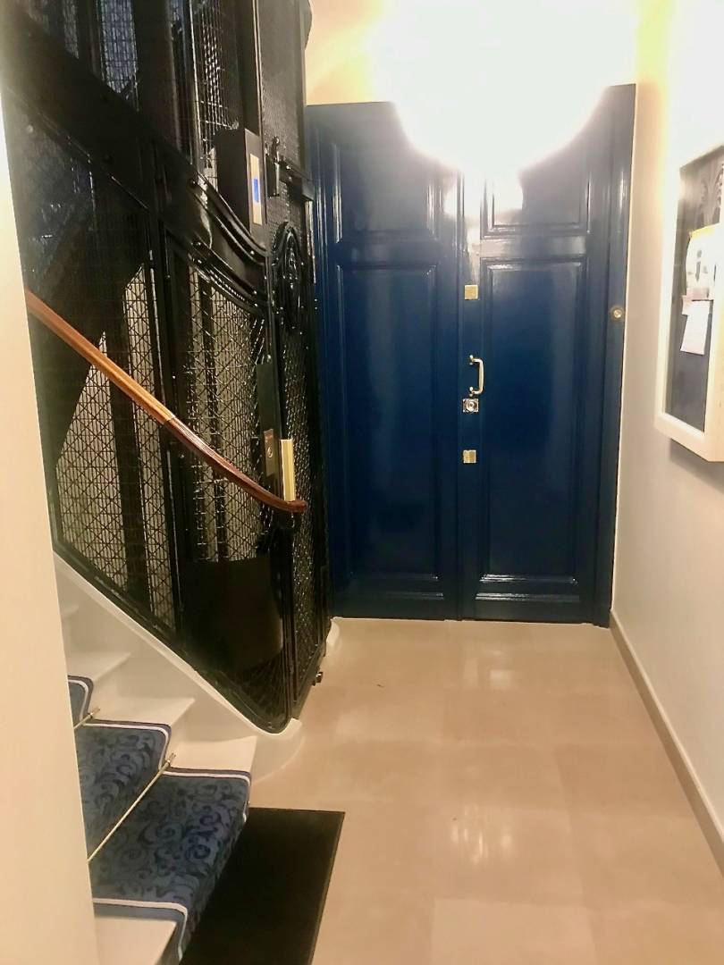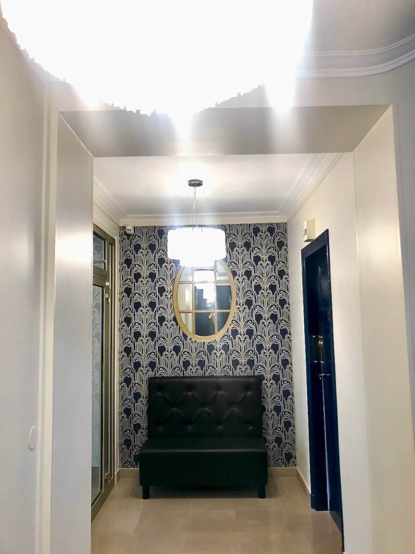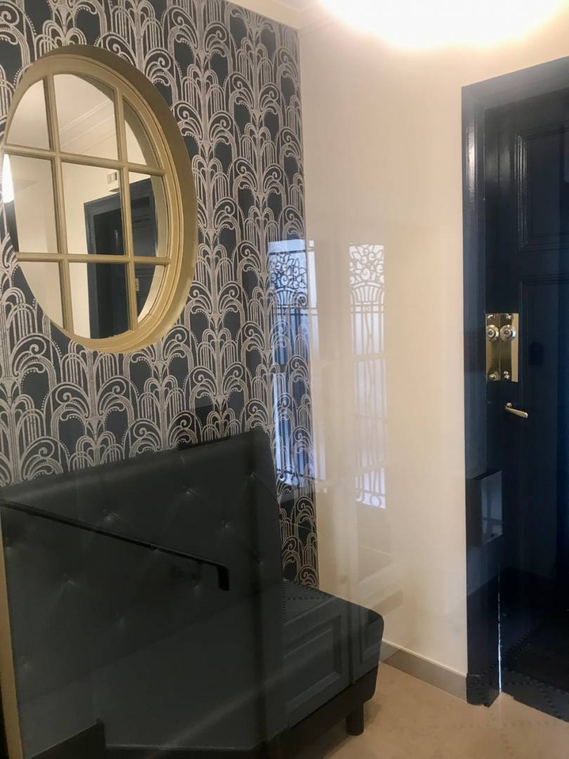 Des parties communes totalement rénovées avec des matériaux de qualité, qui redonnent à cet immeuble toute sa dignité. Une invitation à entrer dans un lieu accueillant et chaleureux, déjà comme un intérieur d'appartement, avec une banquette, de jolis luminaires, ...