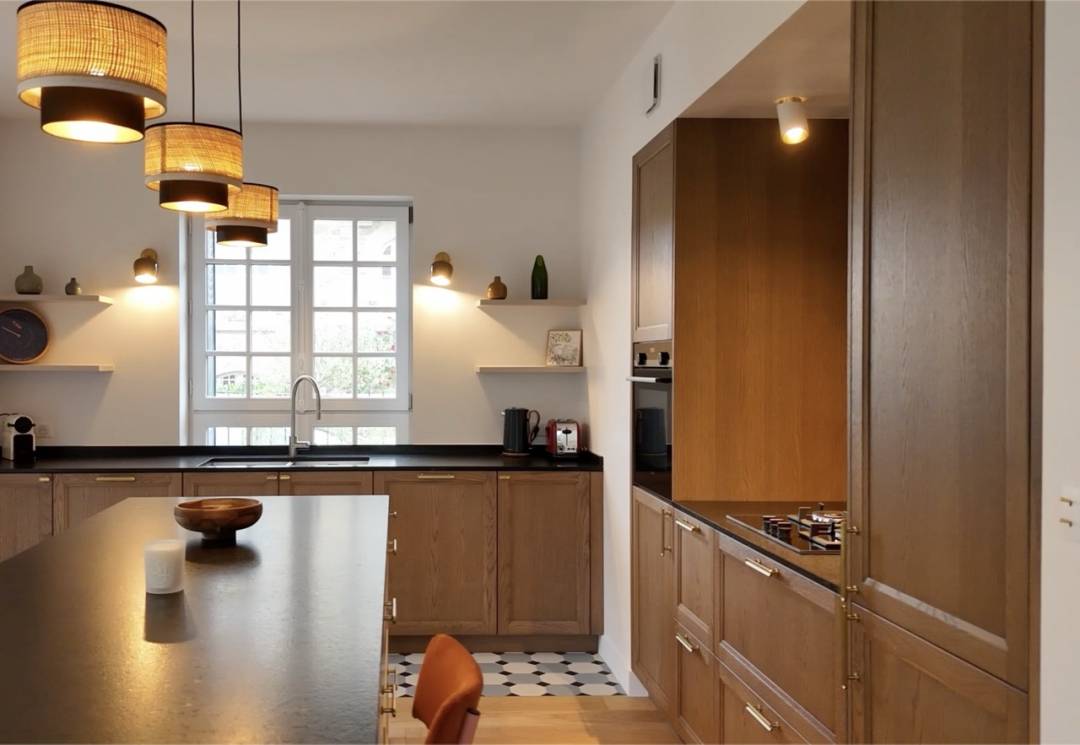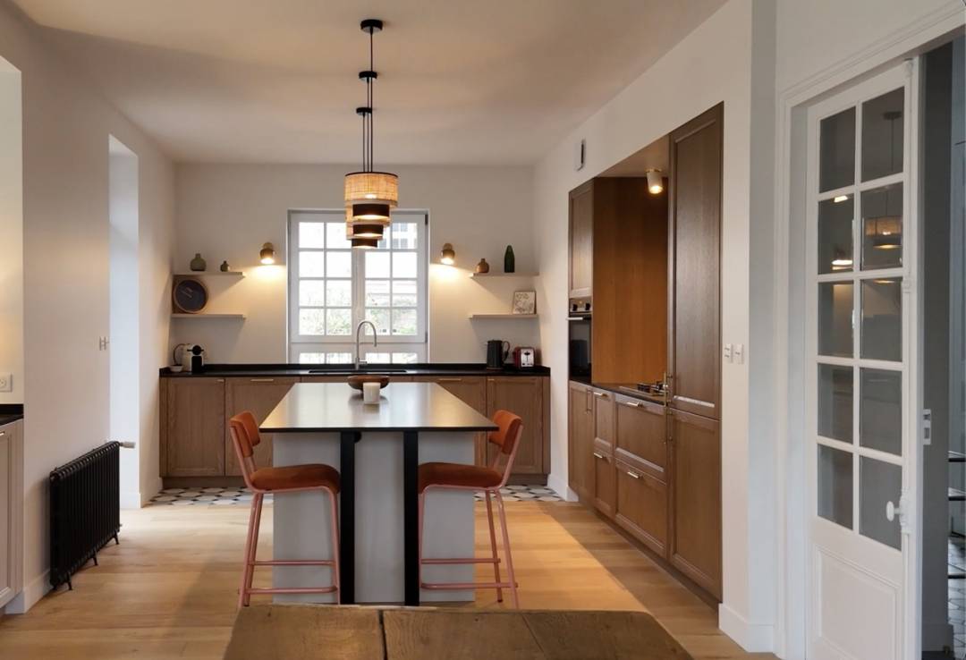 Des matériaux nobles et authentiques pour cette cuisine dans le cadre de la rénovation totale de cette maison dinardaise (granit, chêne, ...).
