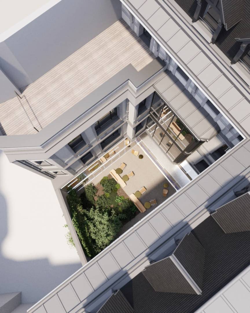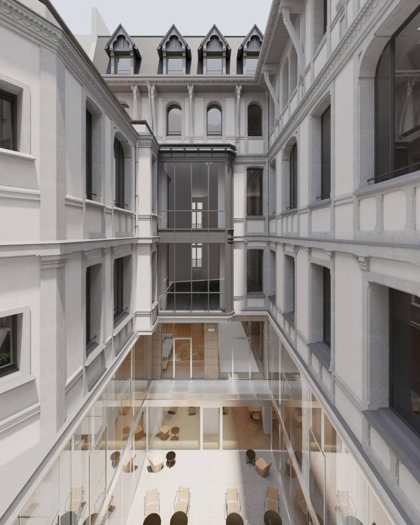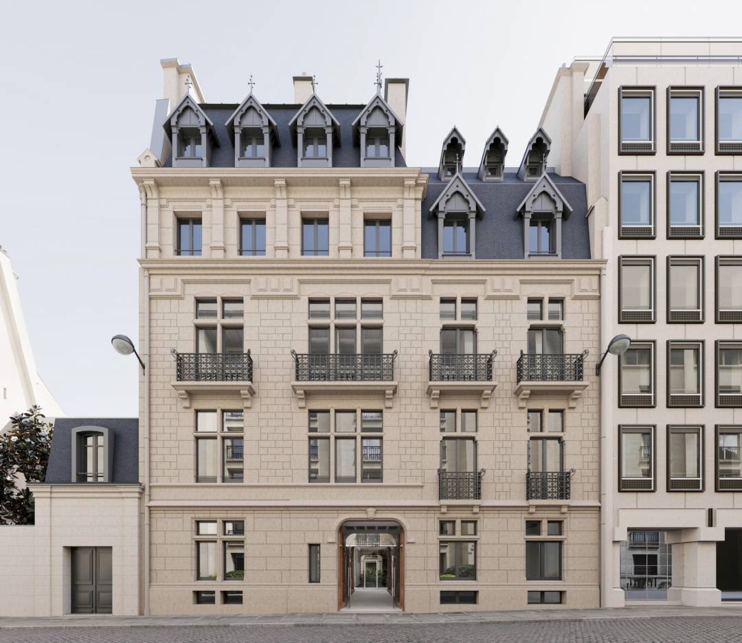 Le projet du 52 Monceau concerne la rénovation d'un immeuble parisien datant de la seconde moitié du XIXème siècle. Il est situé dans le quartier de l'Etoile à Paris 8, caractérisé par son activité tertiaire très dynamique. L'objectif de l’opération consiste en la remise aux normes et la valorisation de ce bien immobilier patrimonial. Tout en préservant sa typologie d’origine, il est question d’adapter cette architecture historique aux nouveaux modes de travail et aux nouvelles attentes de performances énergétiques et environnementales. L’immeuble existant est constitué d’un rez-de-chaussée et de quatre étages. Les interventions sur le bâtiment se centrent principalement sur une restructuration du sous-sol permettant la création d’un rez-de-jardin ouvert sur des espaces extérieurs collaboratifs; une rénovation de l’ensemble des espaces intérieurs, dont les plateaux de bureaux ; ainsi que la réalisation d’une terrasse en étage et de verrières en toiture. Pour répondre aux dernières exigences en termes de sécurité incendie, d’accessibilité et d’isolation thermique, il est également mis en place un ascenseur, des escaliers de secours en étage, des sanitaires accessibles, des complexes isolants intérieurs, et un raccordement au réseau de chaleur et de froid de la ville. Côté rue, la façade est rénovée afin de valoriser et de redonner de l’éclat aux façades en pierre existantes, aux balcons en fer forgé, à la toiture mansardée et à ses lucarnes ; les menuiseries sont remplacées par des menuiseries en bois plus performantes thermiquement ; les équipements techniques situés en toiture sont supprimés et replacés dans des espaces ventilés sous toiture, afin de redonner une cohérence d’ensemble à la volumétrie de la toiture. Côté cour, des façades vitrées sont mises en place au niveau du socle du bâtiment, marquant discrètement la transition entre les espaces intérieurs et extérieurs - le nouveau jardin d’agrément ainsi créé, propose un nouveau lieu de sociabilité servant d’ilot de fraîcheur l’été aux usagers. La démarche environnementale du projet, guidée par les objectifs de réductions de consommations énergétiques du décret tertiaire et ceux des labels HQE et BBCA, anticipe également le futur PLU bioclimatique de Paris.