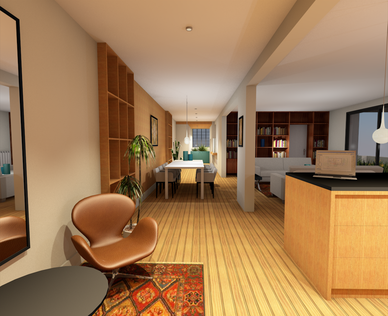 Le but était de créer un espace ouvert sur le jardin et intimiste à la fois. Mon client désirait marier différentes essences de bois et garder les points forts d'origine comme les fenêtres et la bibliothèque. L'espace cuisine à été délimitée avec la création d'une retombée au plafond habillée du même plaquage que la cuisine et au final une baie vitrée a été créée pour ouvrir sur le jardin.